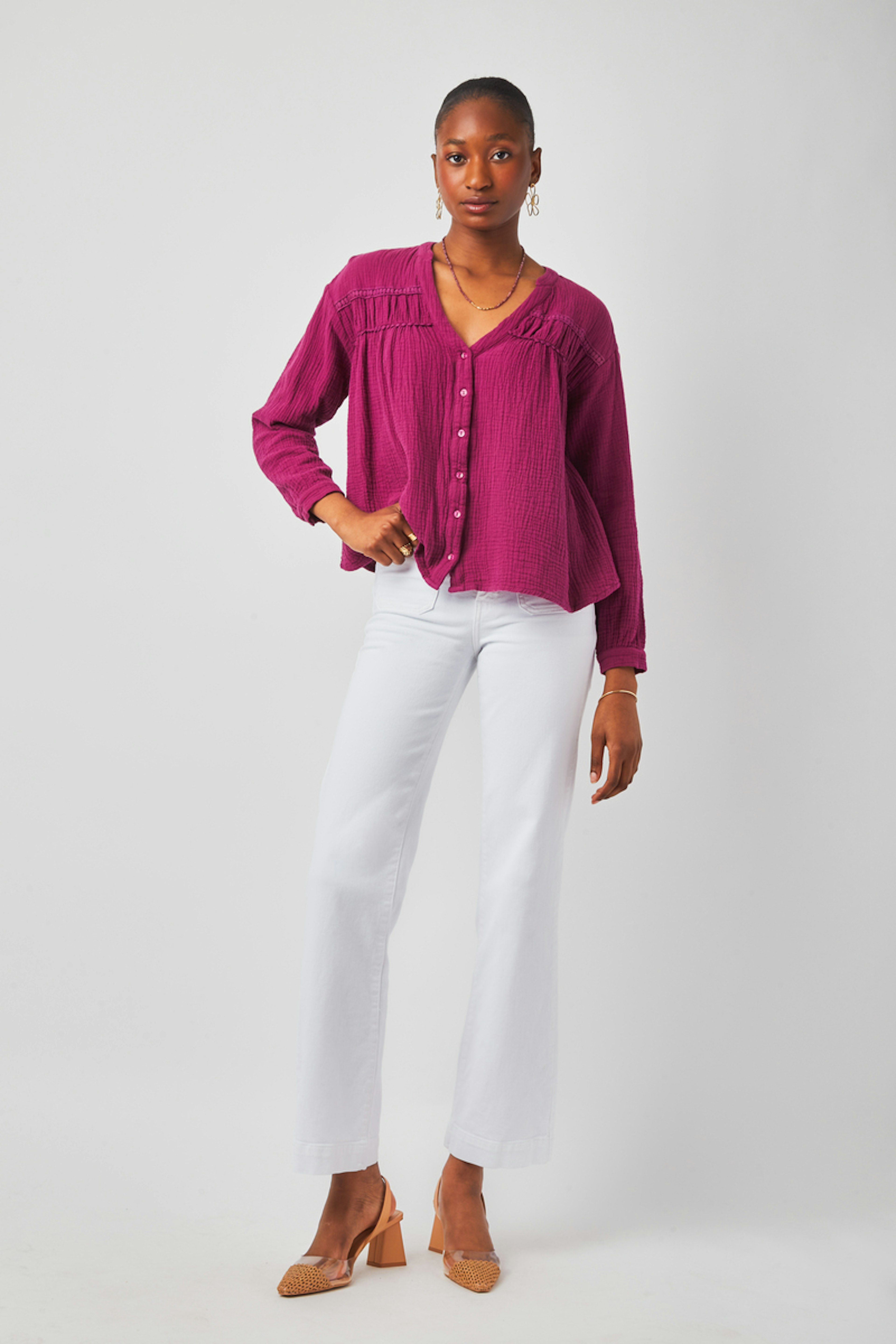 โข Blouse ร manches longues boutonnรฉes โข Tissu en double gaze de coton โข Col V โข Coupe ample โข Dรฉtail en dentelle sur le devant