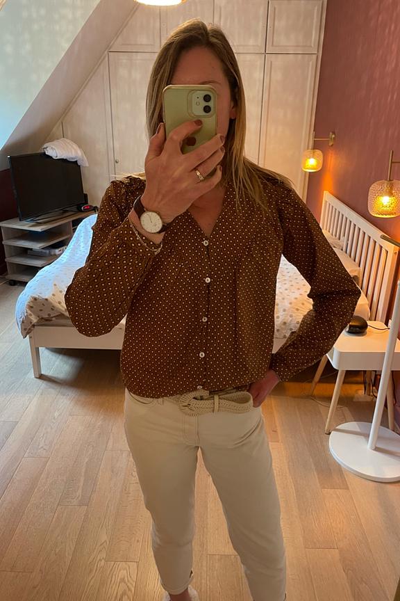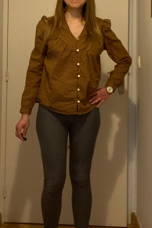 โข Blouse ร manches longues, amples et boutonnรฉes โข Col V โข Imprimรฉ ร pois โข Coupe lรฉgรจrement ample โข Patte de boutonnage sur le devant โข Volants au niveau des รฉpaules