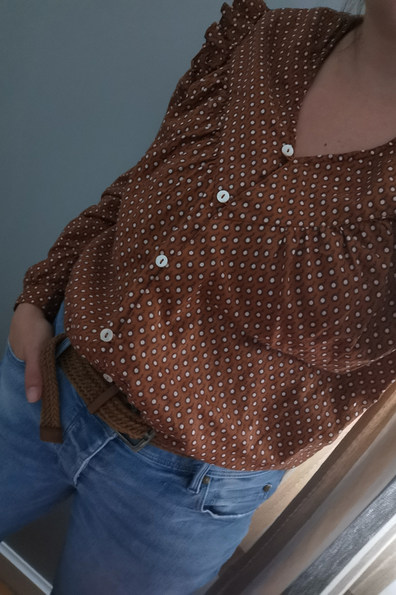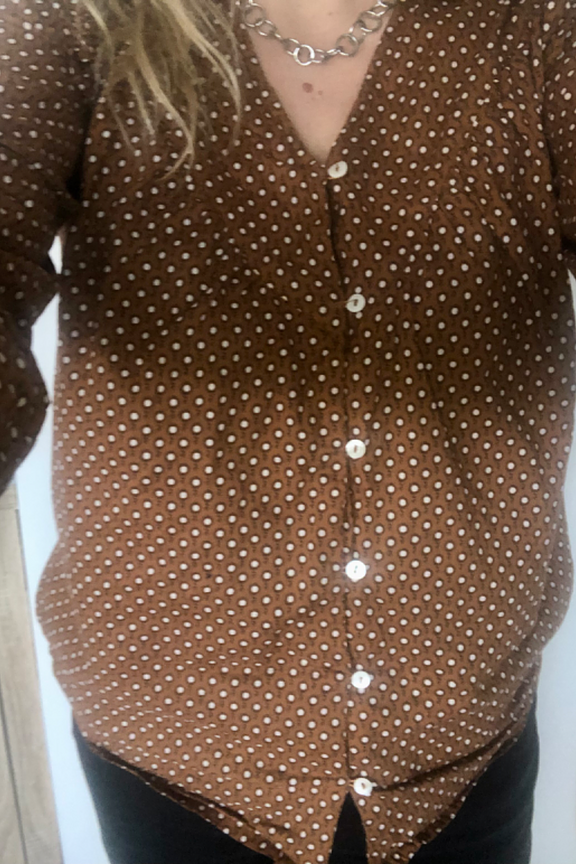 โ€ข Blouse ร  manches longues, amples et boutonnรฉes โ€ข Col V โ€ข Imprimรฉ ร  pois โ€ข Coupe lรฉgรจrement ample โ€ข Patte de boutonnage sur le devant โ€ข Volants au niveau des รฉpaules