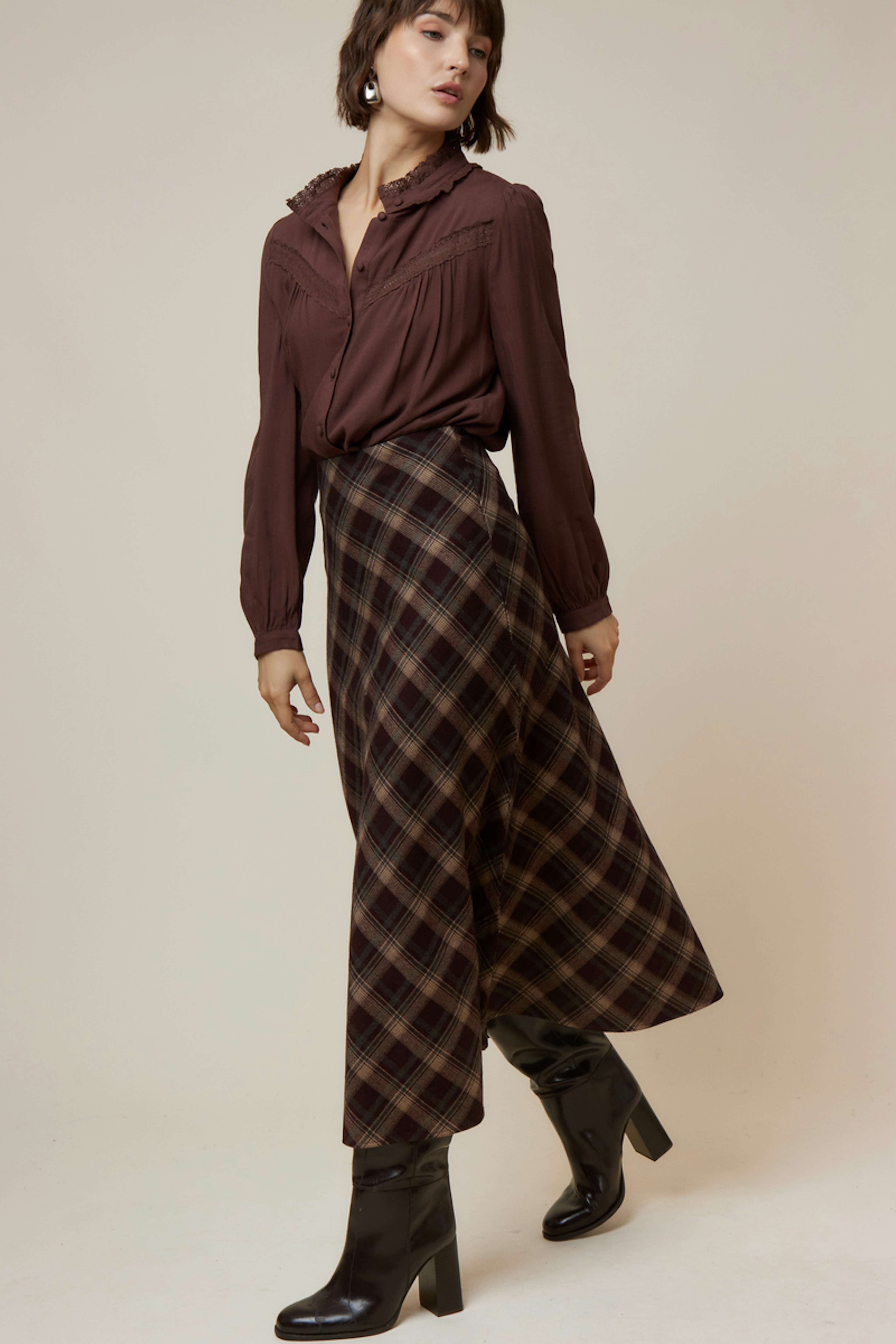 Associez cette blouse avec une jupe en laine pour un look hivernal élégant et chaleureux. Parfait pour une journée au bureau ou une sortie en ville. • Blouse en tissu fluide • Col montant à volants • Manches longues bouffantes • Boutons ton sur ton • Détails de dentelle