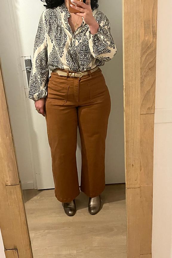 Associez cette blouse à un pantalon en velours pour une élégance hivernale raffinée. • Blouse imprimée • Col Mao • Manches longues • Coupe ample • Motif graphique