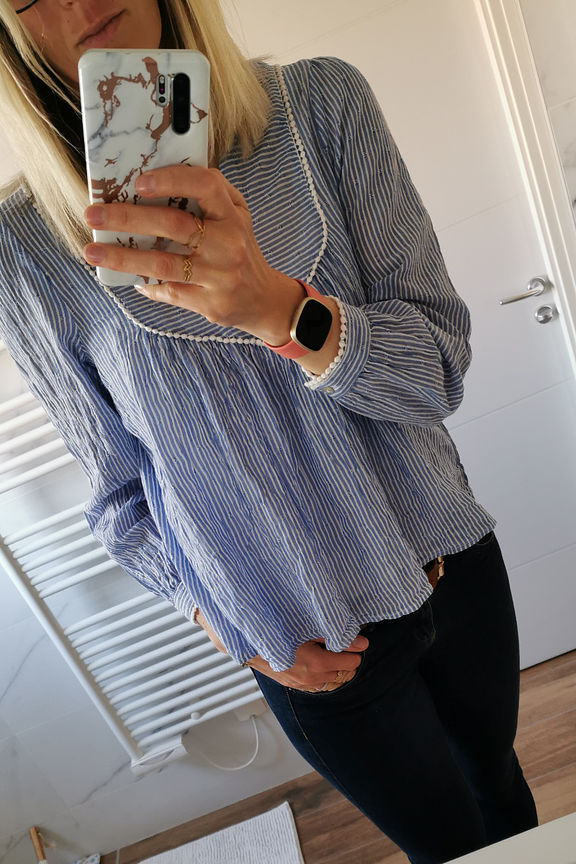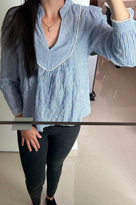 โข Blouse ร rayures bleues et blanches โข Manches longues boutonnรฉes โข Col V โข Coupe ample โข Plastron avec dentelle pompon โข Dentelle pompon aux poignets