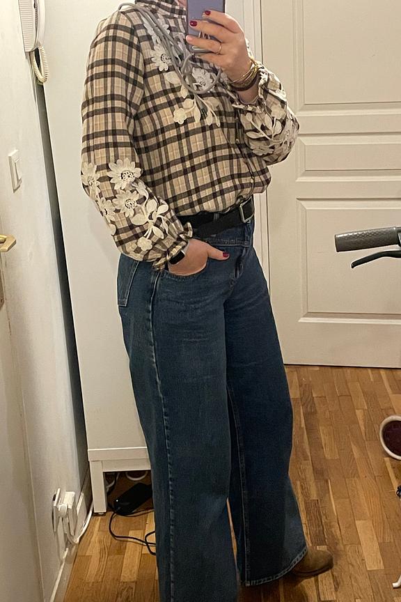 Associez cette blouse à un jean brut et des bottines pour un look élégant et cosy en hiver. • Blouse à manches longues • Coupe légèrement ample • Motif à carreaux • Col mao élégant • Détails brodés floraux