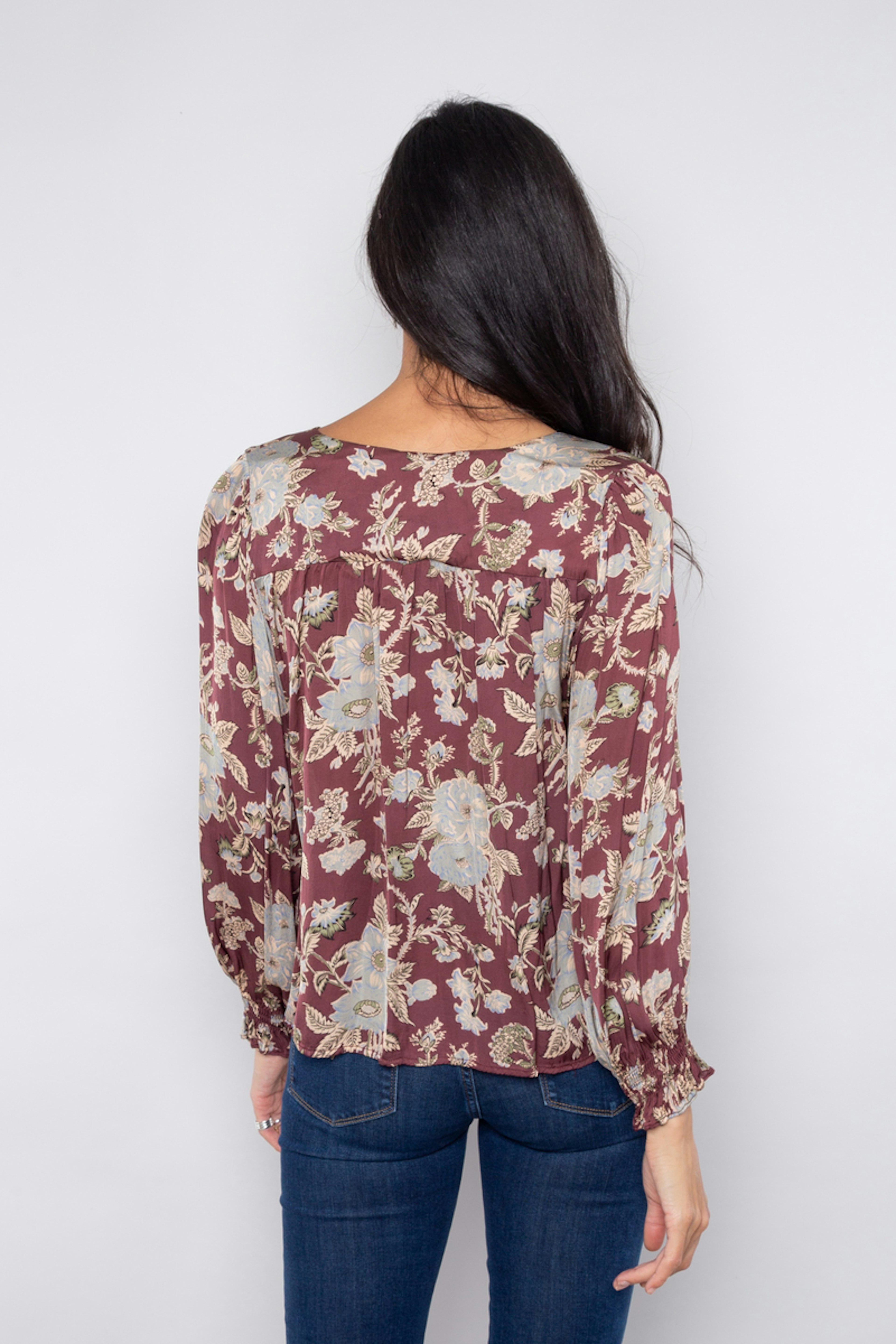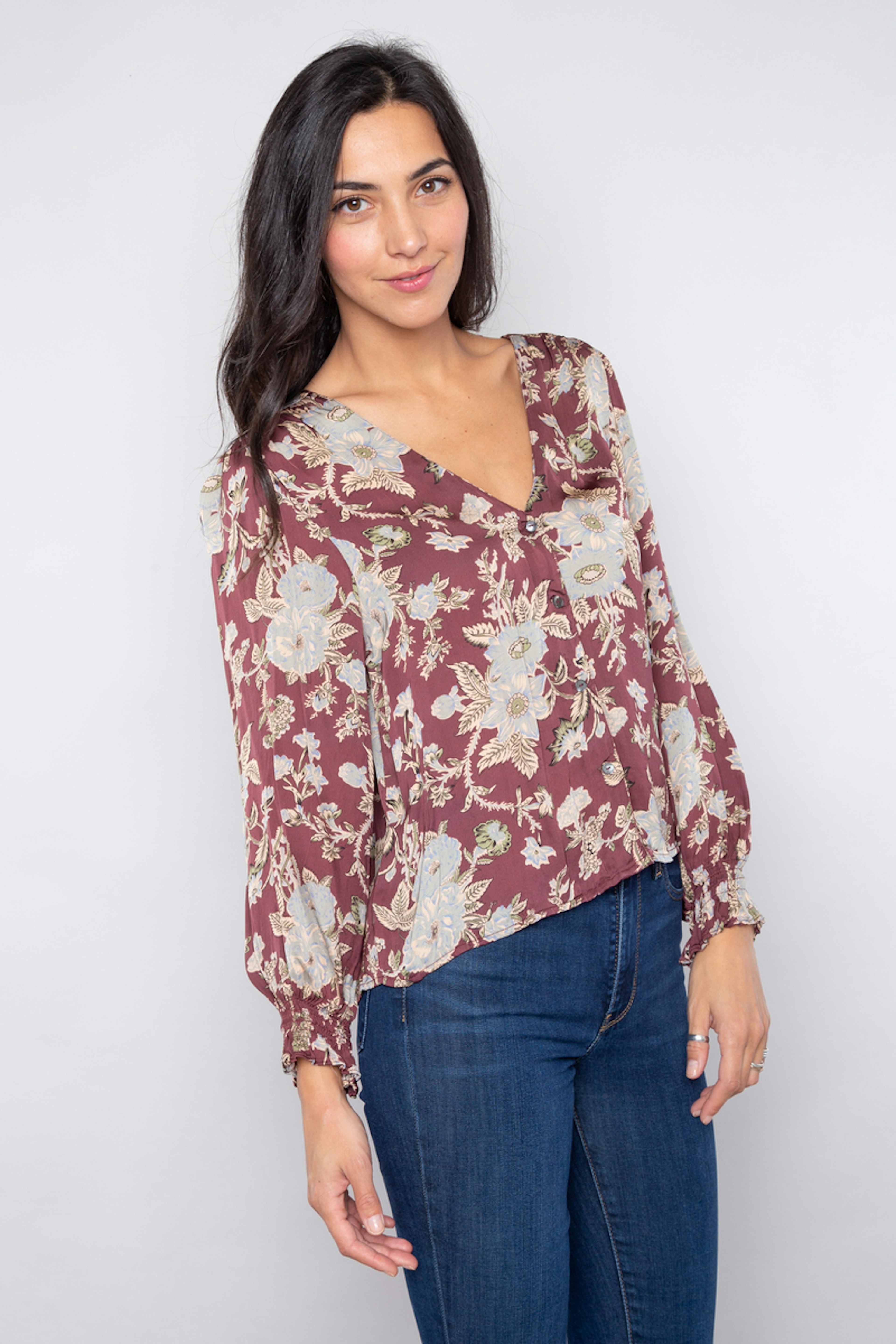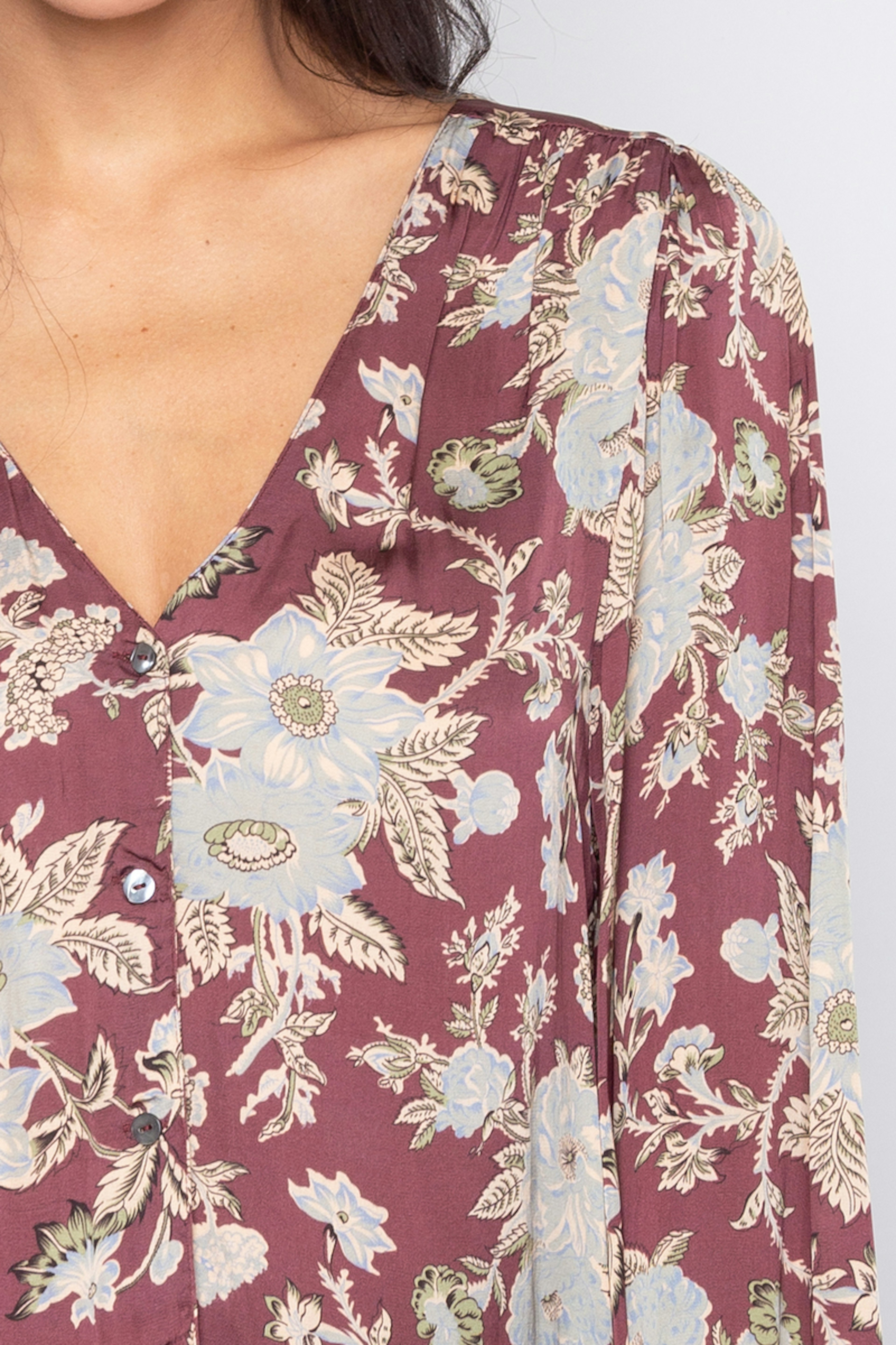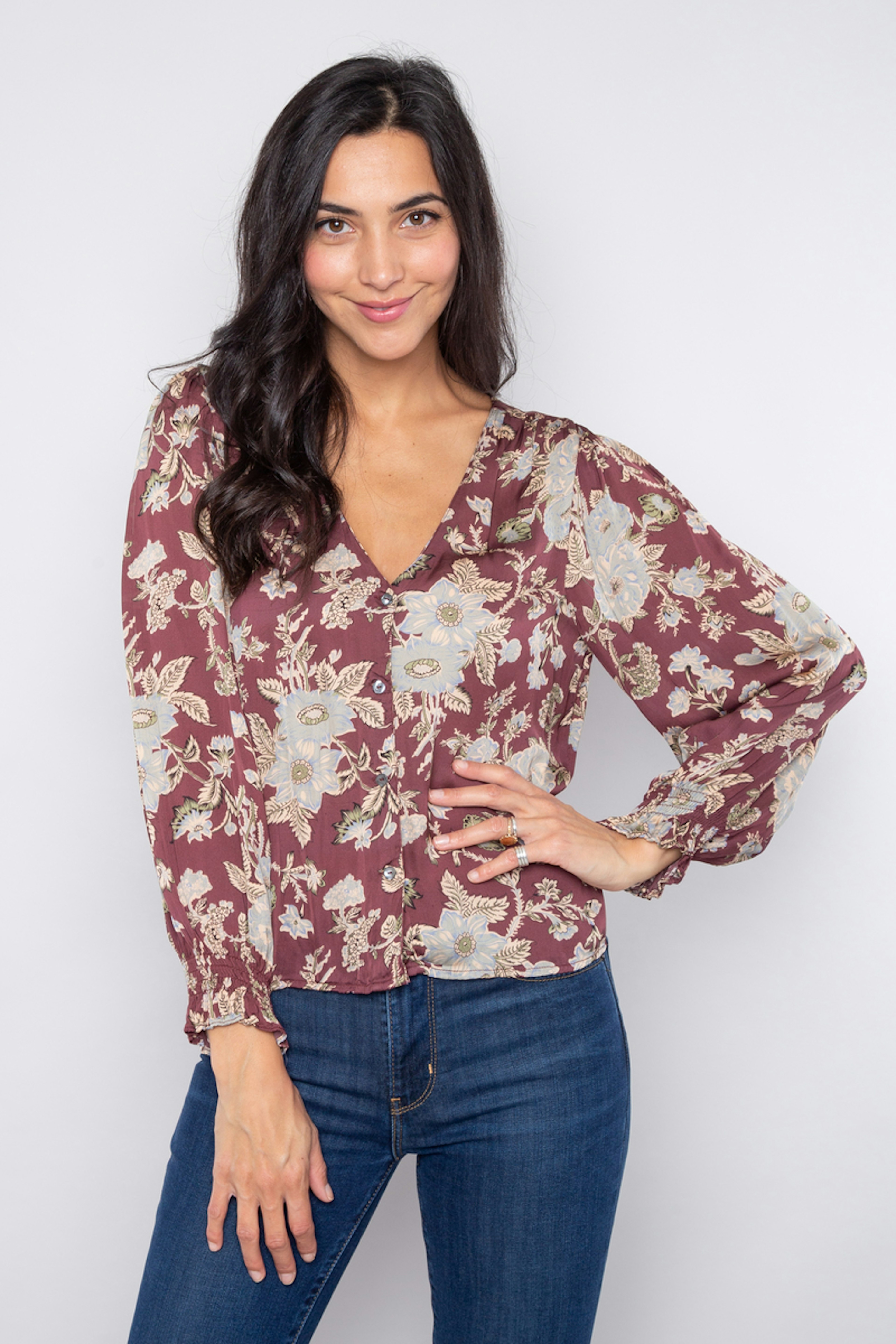 La blouse Lorie est une blouse chemisier comme on les aime ! Poignets smockรฉs, col en V, tombรฉ fluide et matiรจre aรฉrienne, cโ€™est la blouse vaporeuse indispensable du vestiaire. โ€ข Blouse ร  motif fleuri en all-over โ€ข Col en V plongeant โ€ข Ouverture sur lโ€™avant avec boutons effet nacrรฉ โ€ข Manches bouffantes โ€ข Smocks aux poignets avec petits volants โ€ข Fronces aux รฉpaules