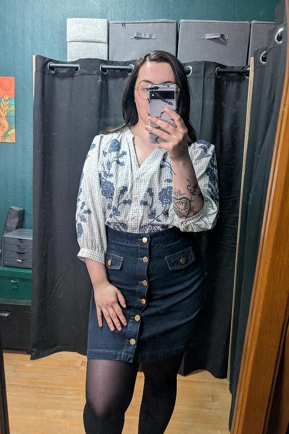 Associez cette blouse avec un jean flare et des bottines pour un look hivernal raffiné. • Blouse en coton • Manches bouffantes • Décolleté en V • Imprimé floral • Tissu texturé