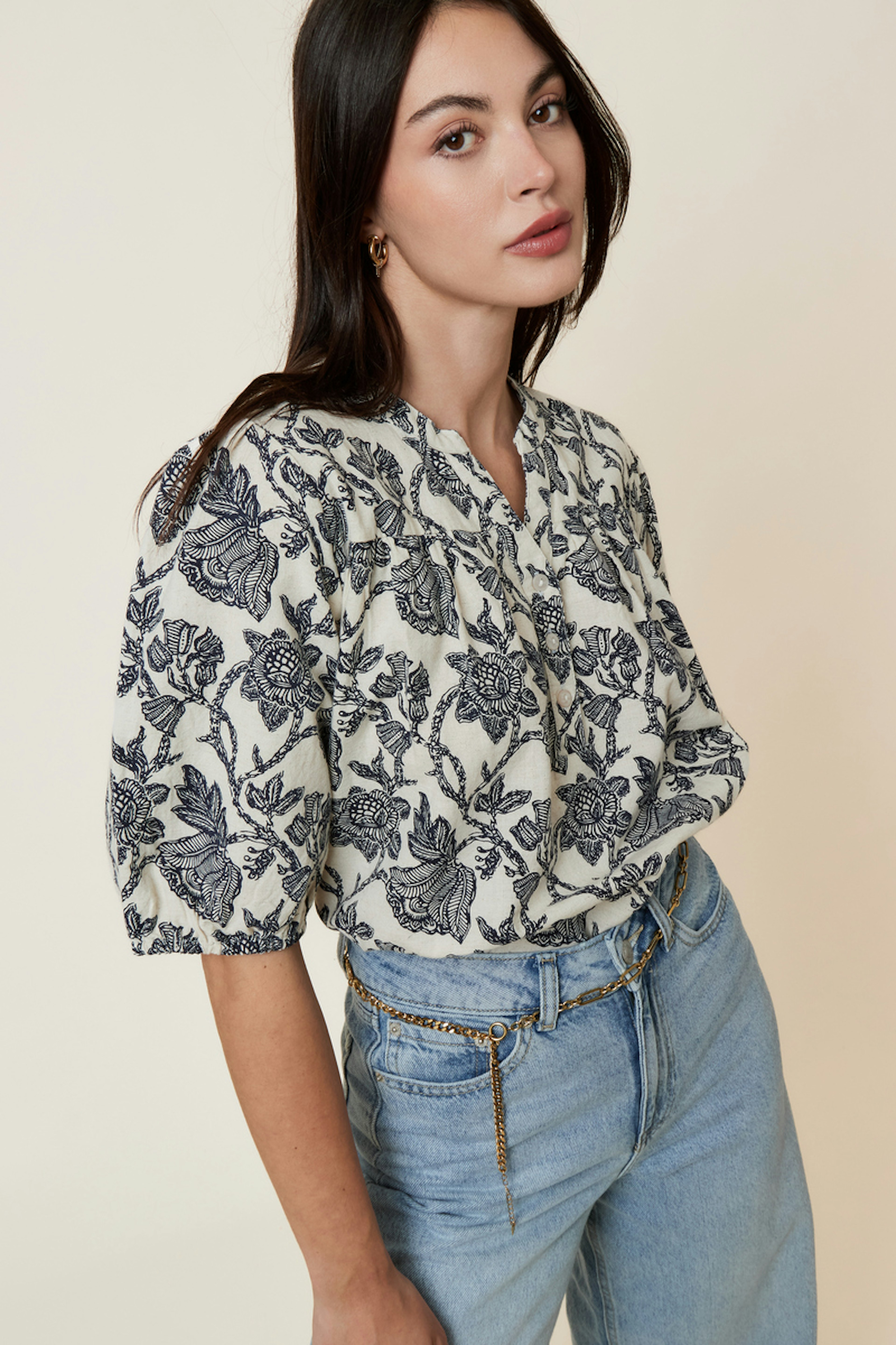 Associez cette blouse à un jean clair et des sandales pour un look estival chic et décontracté. • Blouse en coton et lin • Col V • Manches courtes • Imprimé floral • Coupe ample et confortable