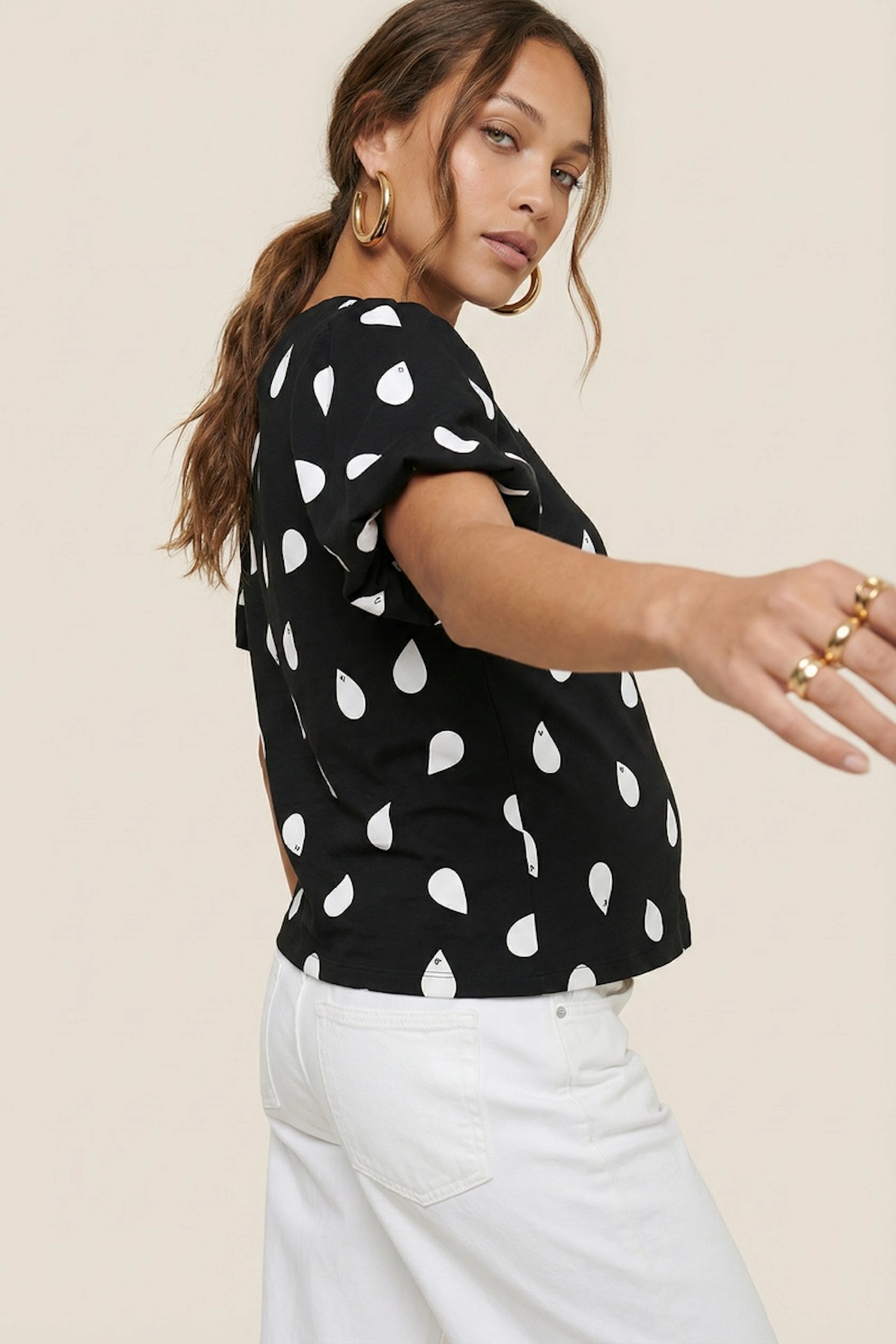 Associez cette blouse Tajinebanane à un jean slim blanc et des sandales pour une allure chic estivale. • Blouse en coton • Manches courtes bouffantes • Col rond classique • Imprimé graphique • Fente discrète pour allaitement