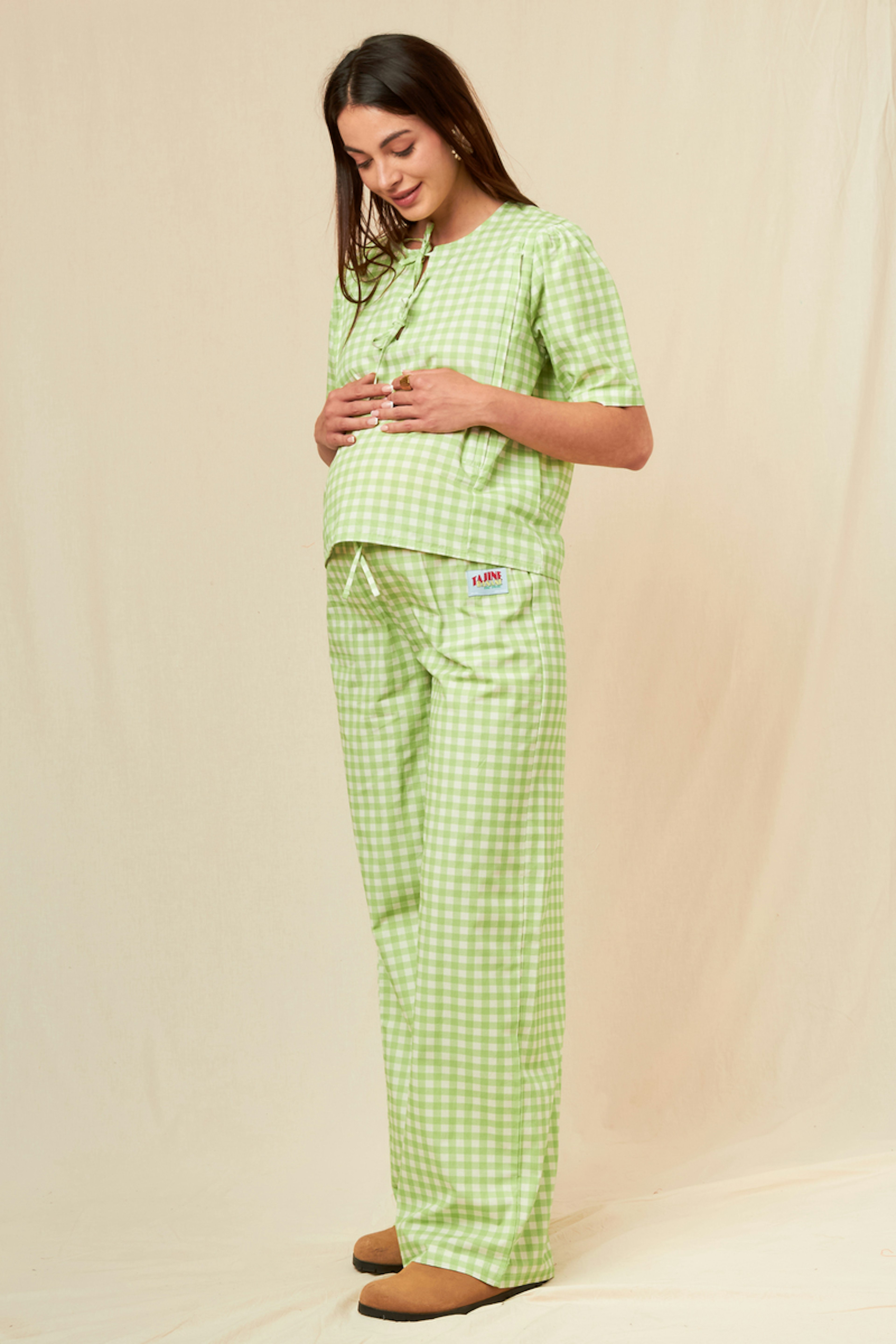Associez cette blouse légère à un jean blanc et des sandales pour un look estival chic. • Blouse d'allaitement en coton • Coupe large et ample • Encolure ronde à nouer • Manches 3/4 froncées • Motif vichy vert et écru