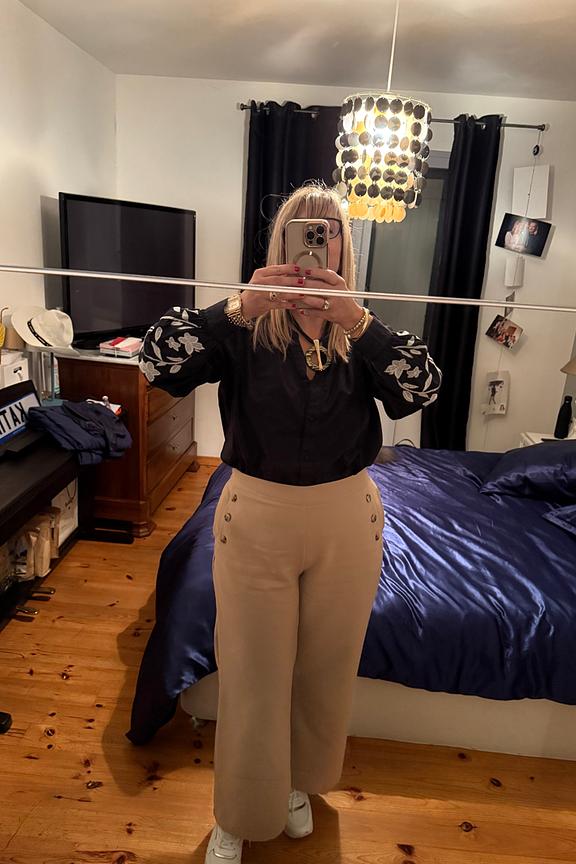 Associez cette blouse à un pantalon fluide et des sandales pour un look estival chic. • Blouse en coton • Col Mao • Manches longues bouffantes • Broderie florale • Fermeture boutonnée devant