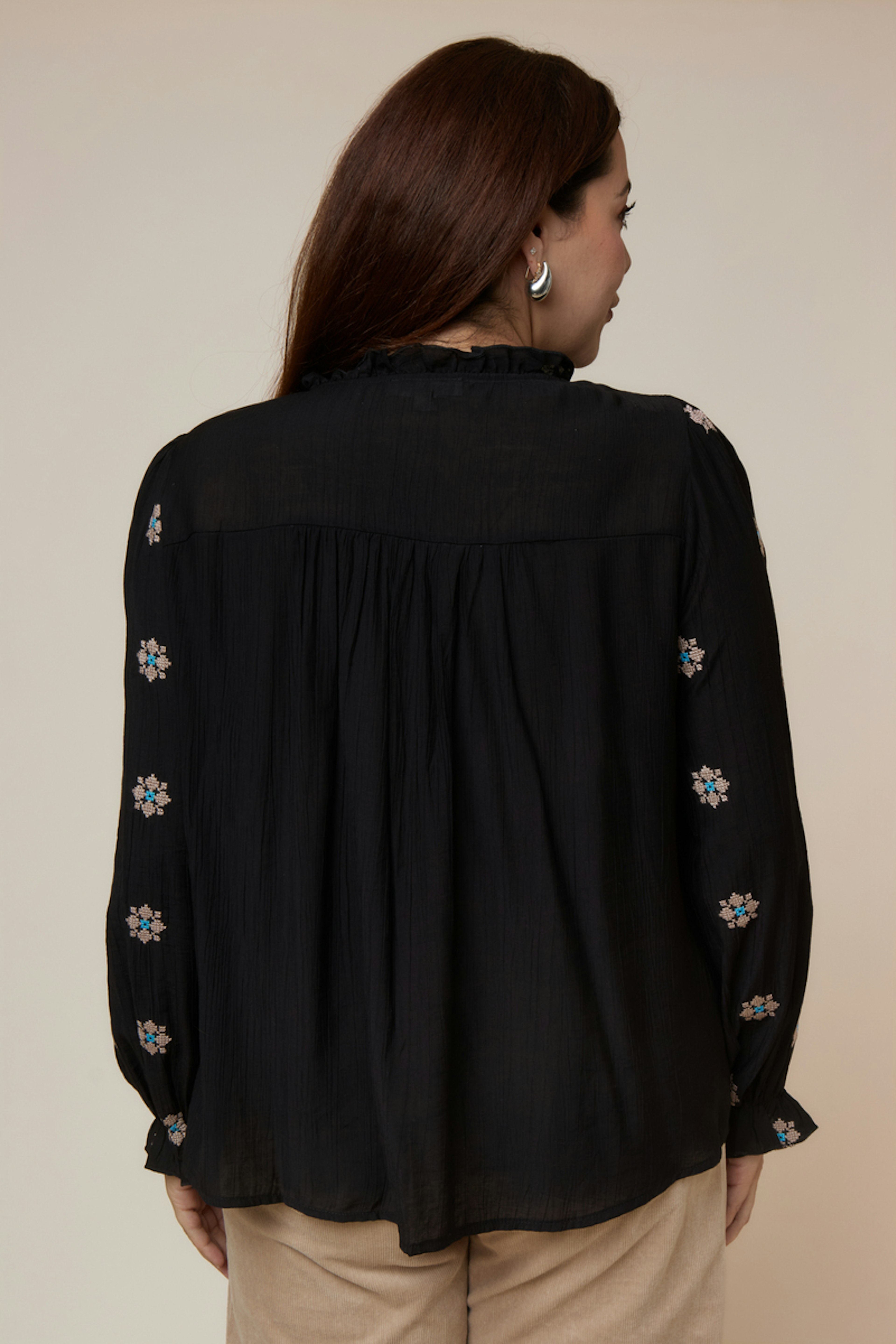 Portez cette blouse avec un jean slim et des bottines pour un look raffiné et cosy, idéal en hiver. • Blouse à imprimé • Col rond • Manches longues bouffantes • Patte de boutonnage • Tissus légèrement texturé