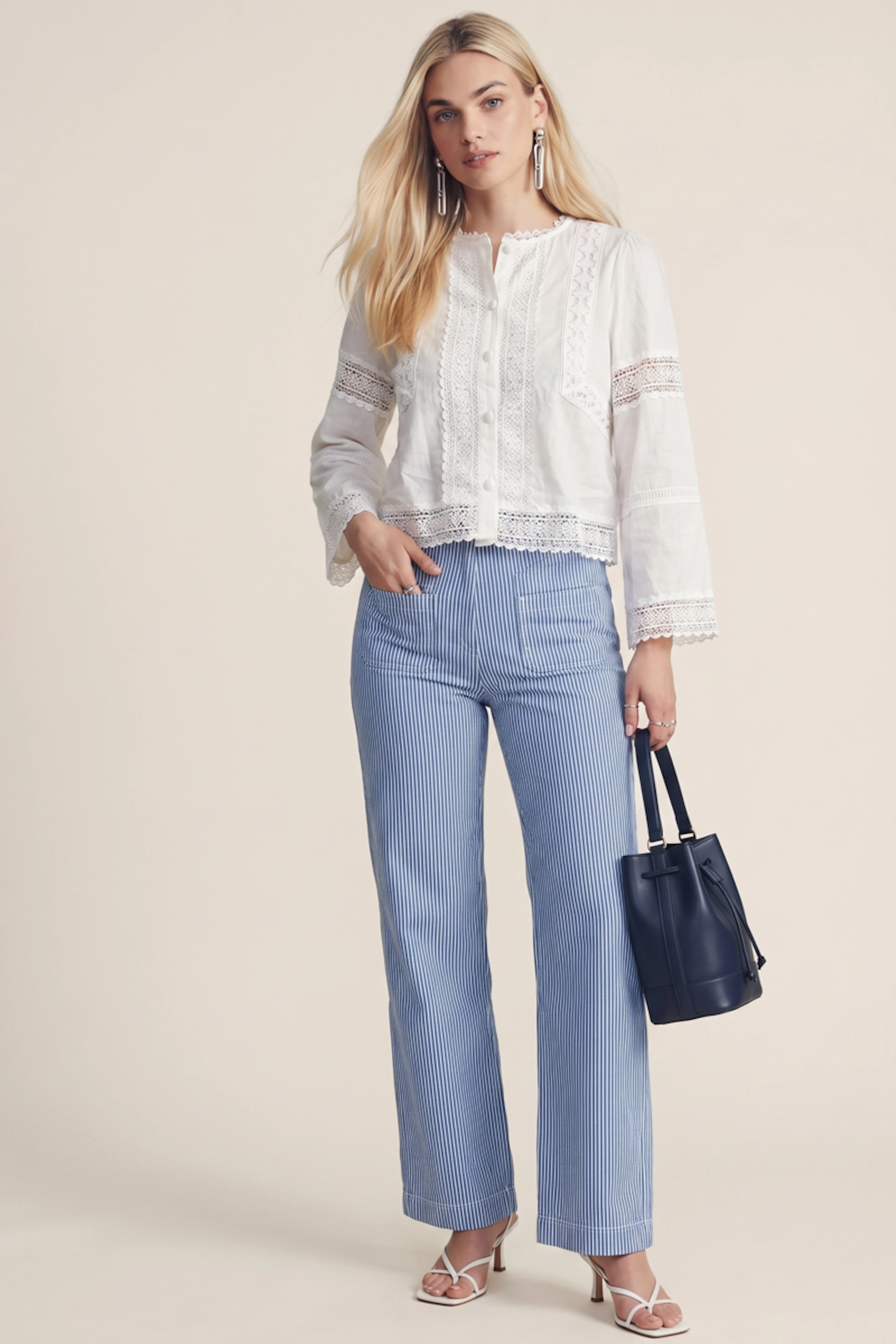 Associez cette blouse avec un pantalon à motifs géométriques et des sandales colorées pour une allure chic. • Blouse en coton • Col rond délicat • Manches longues en dentelle • Boutonnage discret • Détails en broderie florale