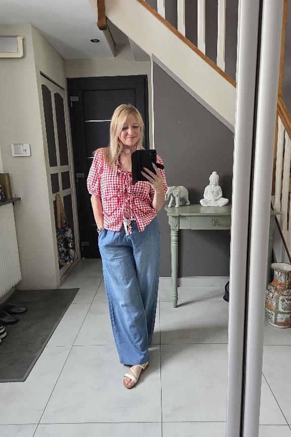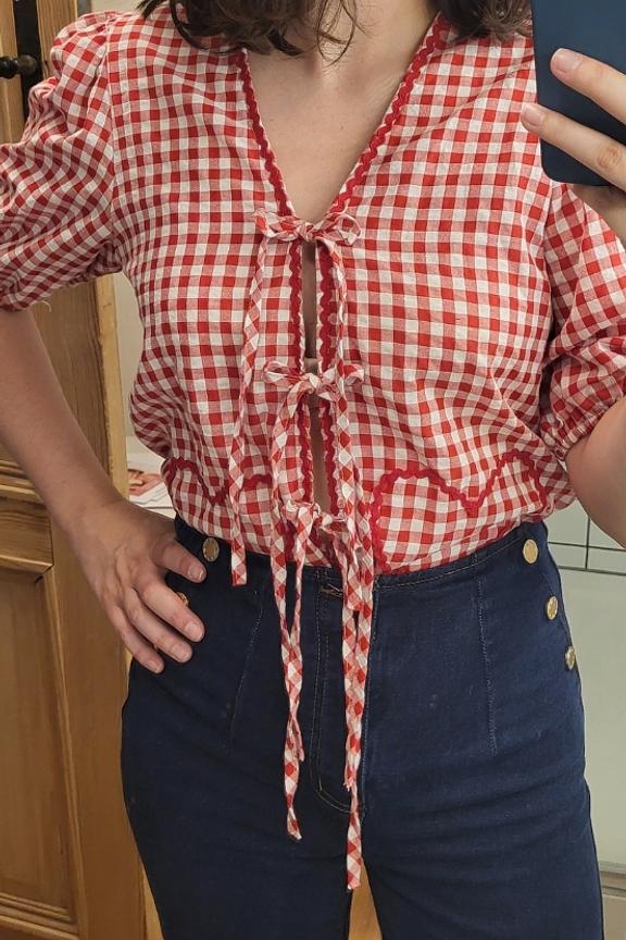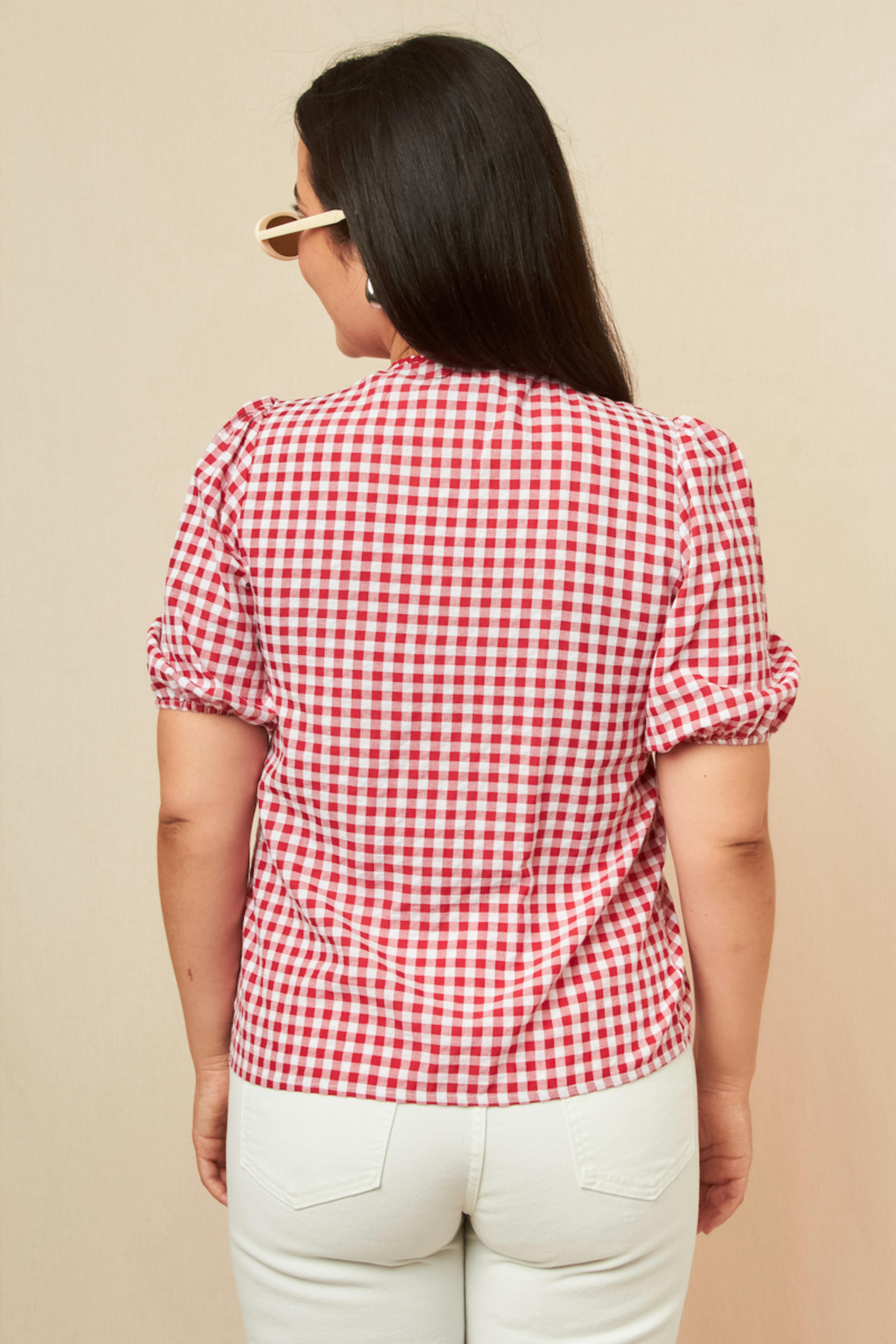 Éclairez votre été avec cette blouse à l'imprimé vif, parfaite avec un jean denim clair et des sandales pour un look décontracté chic. • Blouse courte à nouer • Col en V festonné • Manches courtes bouffantes • Detail cœur contrastant • Vichy rouge • Liens à nouer sur le devant