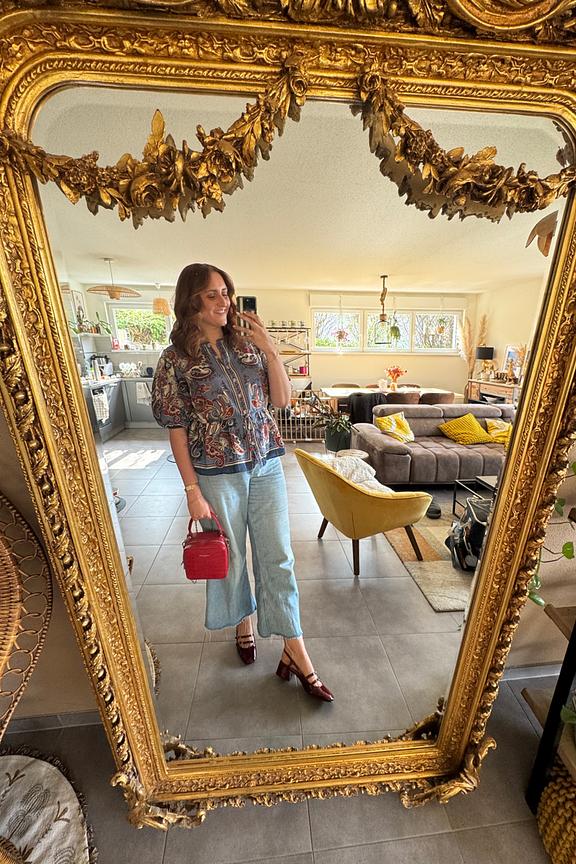 Cette blouse peut être associée à un jean brut et des bottines pour un look décontracté élégant, idéal pour les journées fraîches d'hiver. • Blouse ample en coton • Taille cintrée avec cordon • Manches bouffantes • Encolure ronde • Imprimé floral et cachemire