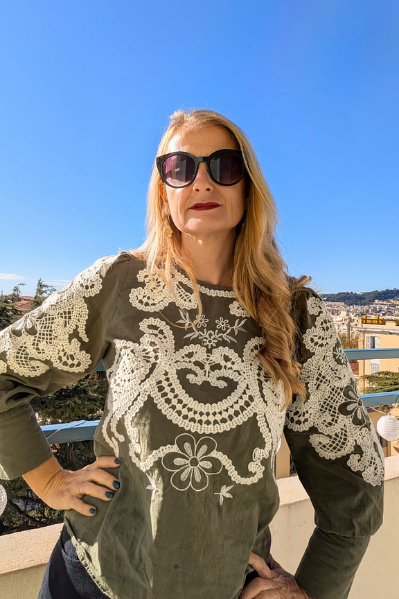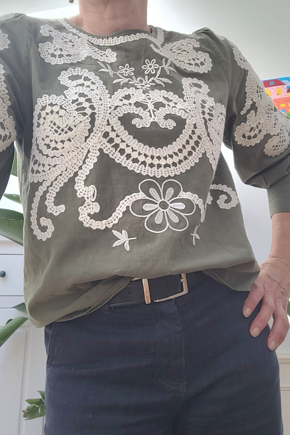 “Très belle blouse, les broderies sont fines, les manches un peu blousantes. ce haut peut peut être porté rentré dans le pantalon pour un côté plus sophistiqué.”