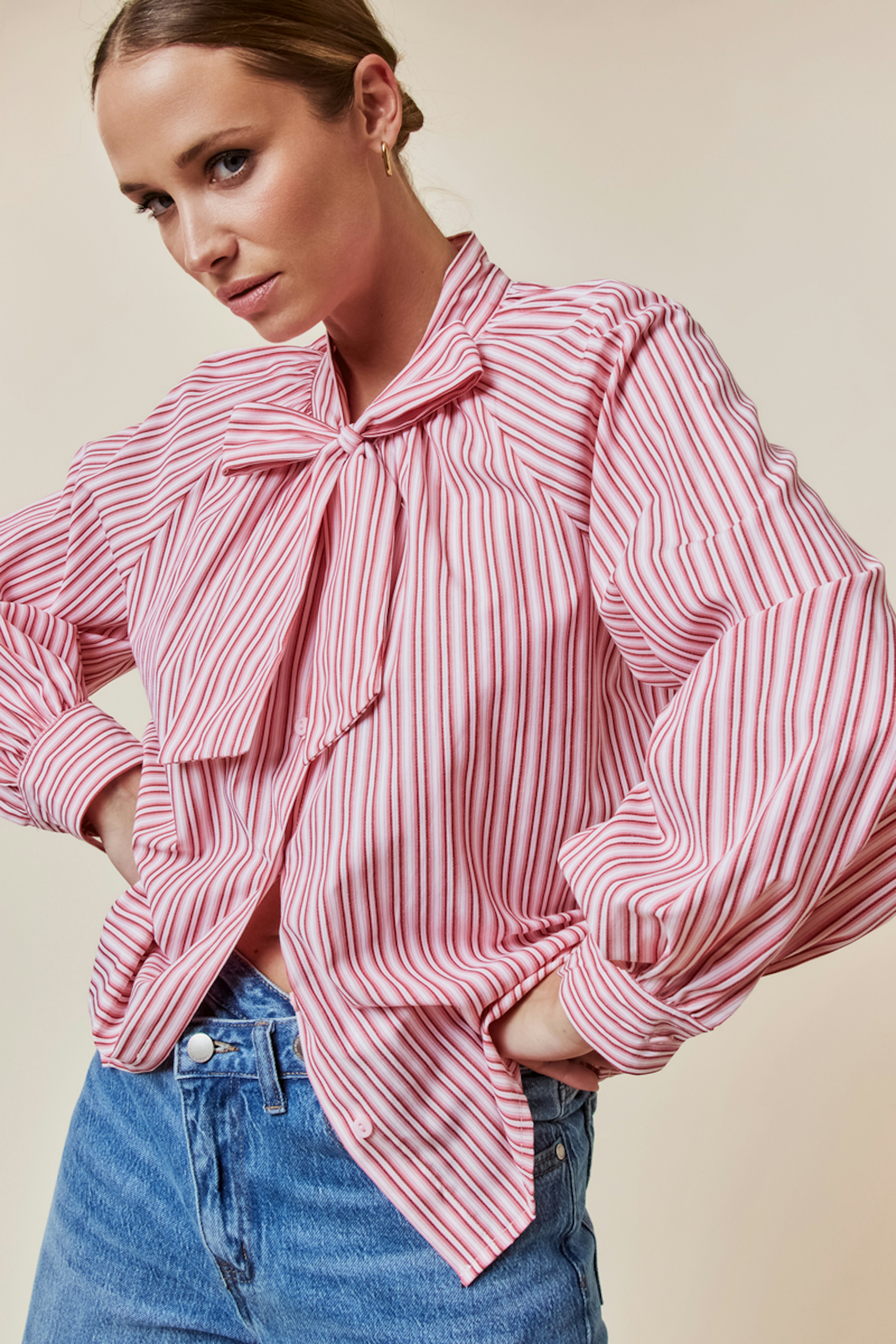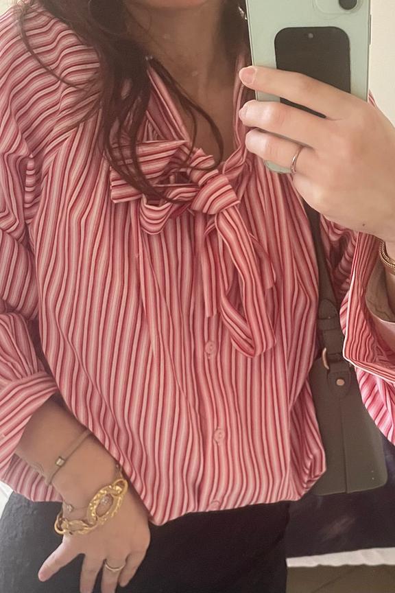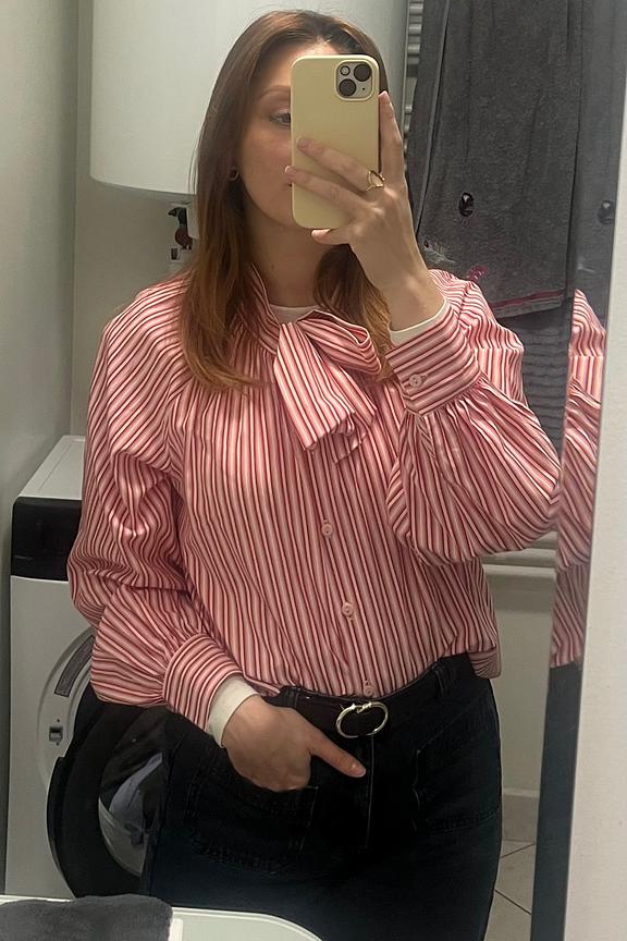 Portez-la avec un pantalon taille haute pour un look chic et moderne. Parfaite pour les journées hivernales. • Blouse à rayures • Coupe ample • Manches longues • Noeud élégant à l'encolure • Poignets boutonnés