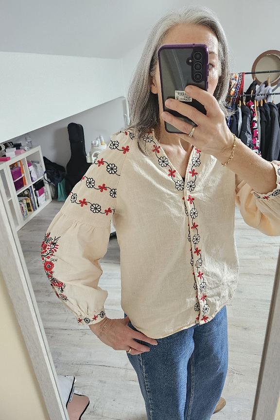 “J'adore ce chemisier style bohème qui va avec tout! Jean ou pantalon à pinces.. la matière ressemble à du lin épais les broderies sont très jolies, longueur de manches parfaite!”