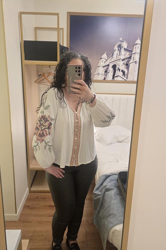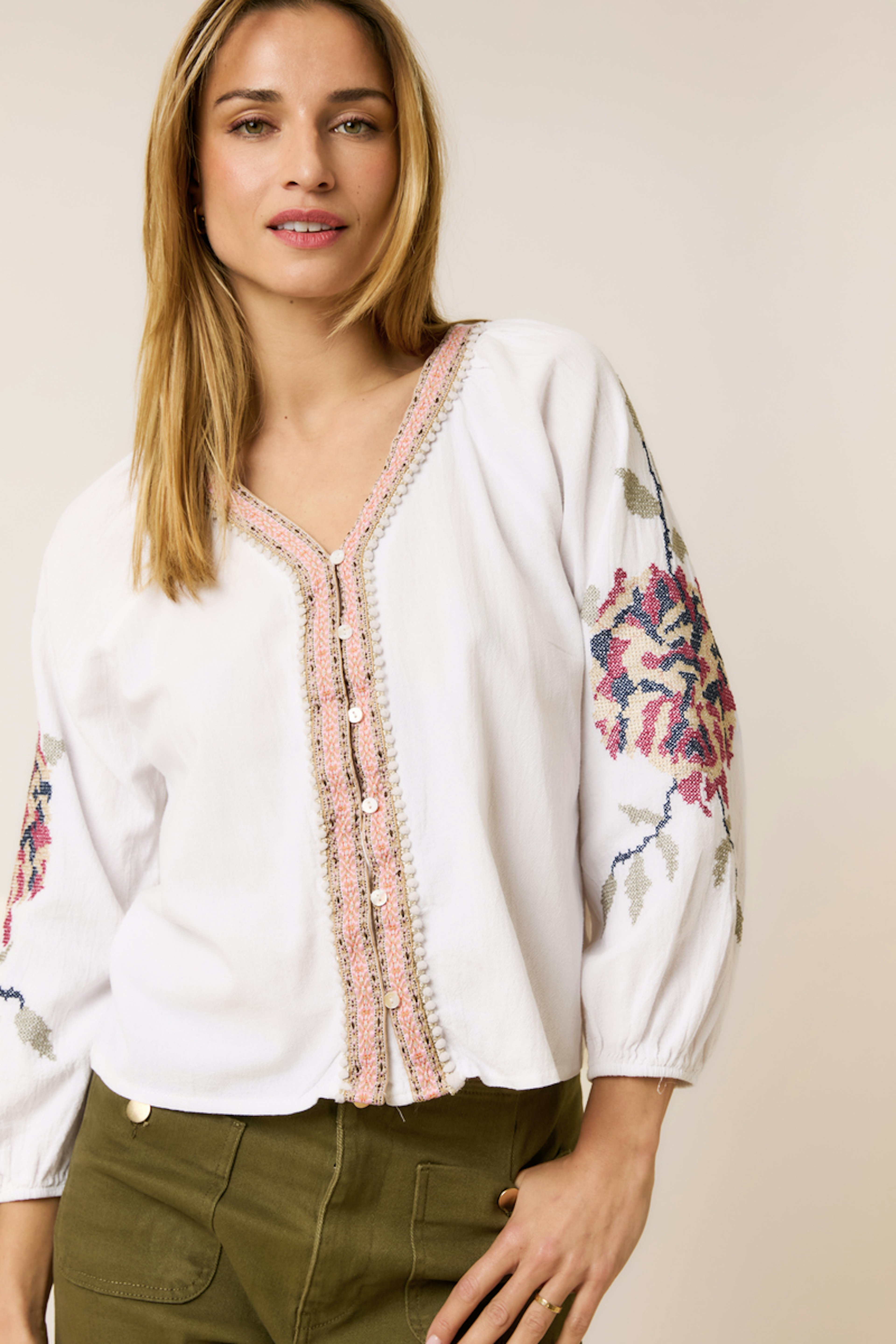 Associez cette blouse à un jean taille haute et des bottines pour un look chic et décontracté. Parfaite en toute saison ! • Blouse en coton • Manches bouffantes • Imprimé floral sur les manches • Encolure en V • Détails brodés délicats