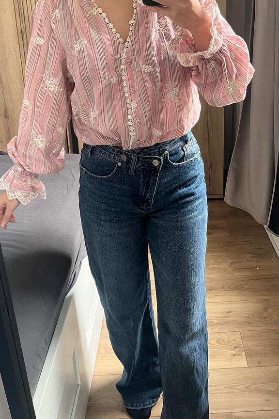 Associez cette blouse légère à un short en jean et des sandales pour une allure estivale décontractée. • Blouse imprimée • Décolleté en V • Manches longues évasées • Détails en dentelle • Boutons délicats sur le devant