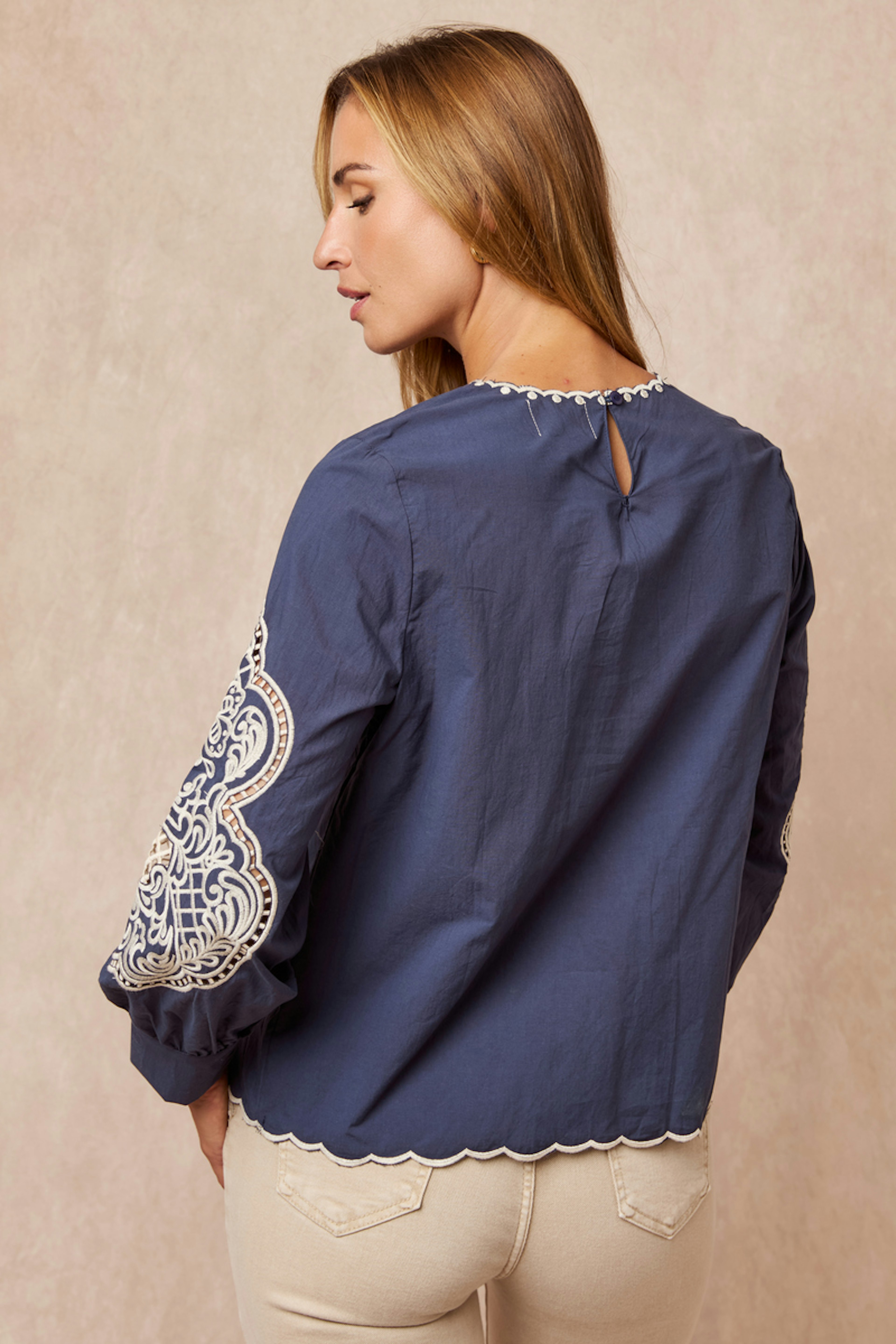 Portez cette blouse avec un pantalon beige et des mocassins pour un look chic et décontracté. Parfait en toute saison. • Blouse en coton • Épaules en dentelle • Manches longues • Détails ajourés • Motif imprimé