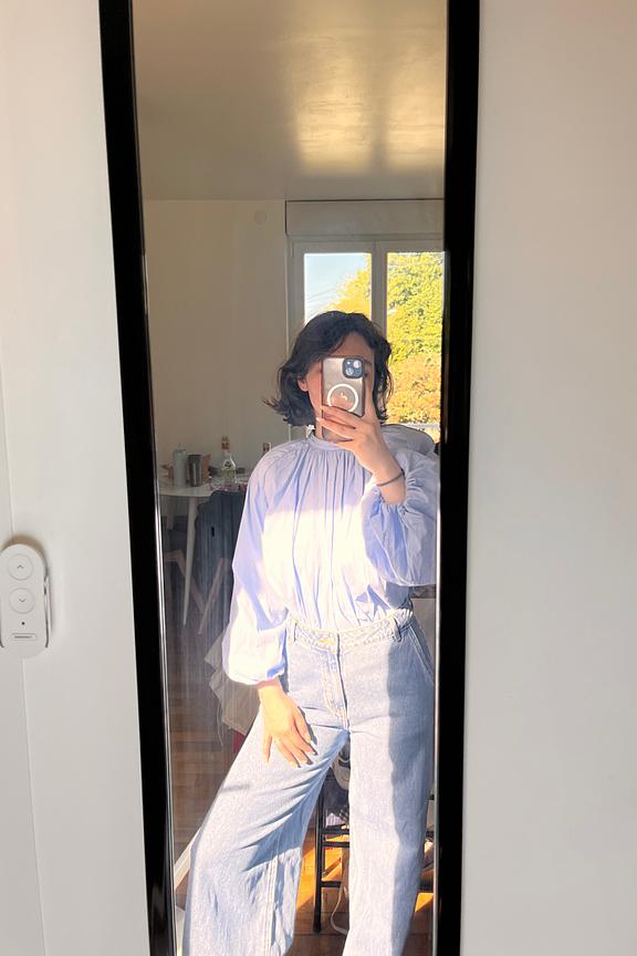 Associez cette blouse à un pantalon cigarette pour un look chic estival. Ajoutez des sandales à talons pour sublimer l'ensemble. • Blouse en coton • Coupe ample • Manches ballon • Dos ouvert avec nœud • Coloris bleu doux