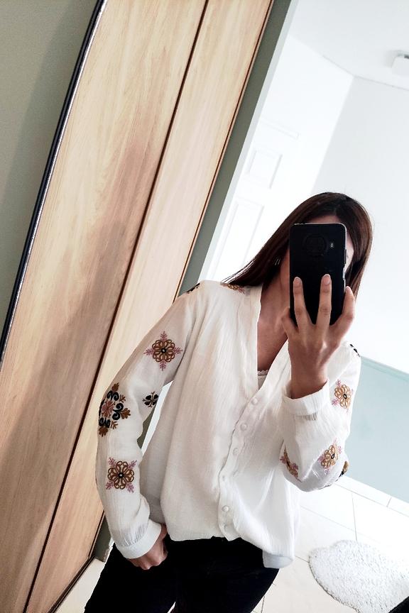 Pour un look chic et bohème, associez cette blouse avec un jean taille haute et des bottines en cuir. Ajoutez des boucles d'oreilles pendantes pour une touche de sophistication. Parfait pour toutes les saisons. • Blouse à manches longues • Encolure en V • Broderies multicolores sur les manches • Boutonnage central • Matière fluide et légère