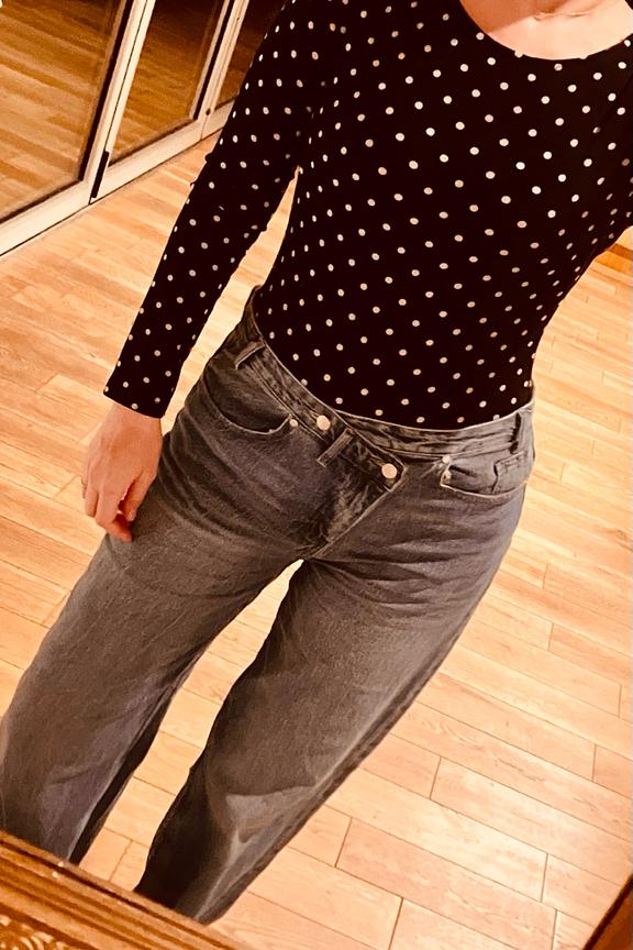 Associez ce body à pois avec un pantalon large pour un look chic et décontracté.. • Body à manches longues • Coupe ajustée • Col bateau • Motif à pois • Tissu stretch qui épouse le corps