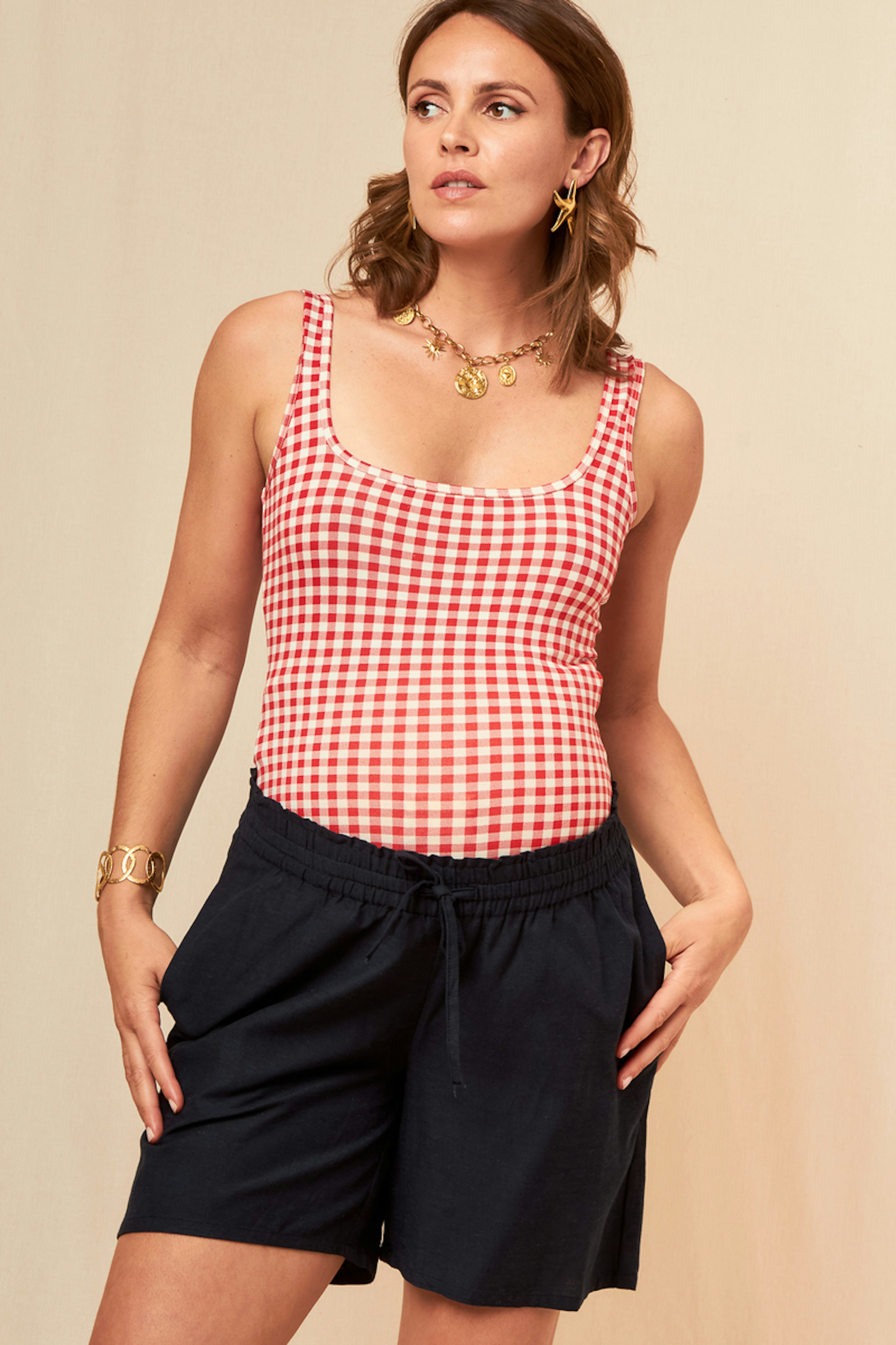 Associez ce body à un short en jean et des sandales pour un look estival décontracté. Parfait pour les journées ensoleillées d'été. • Body • Jersey doux et souple • Col carré • Coupe près du corps • Imprimé vichy rouge et écru
