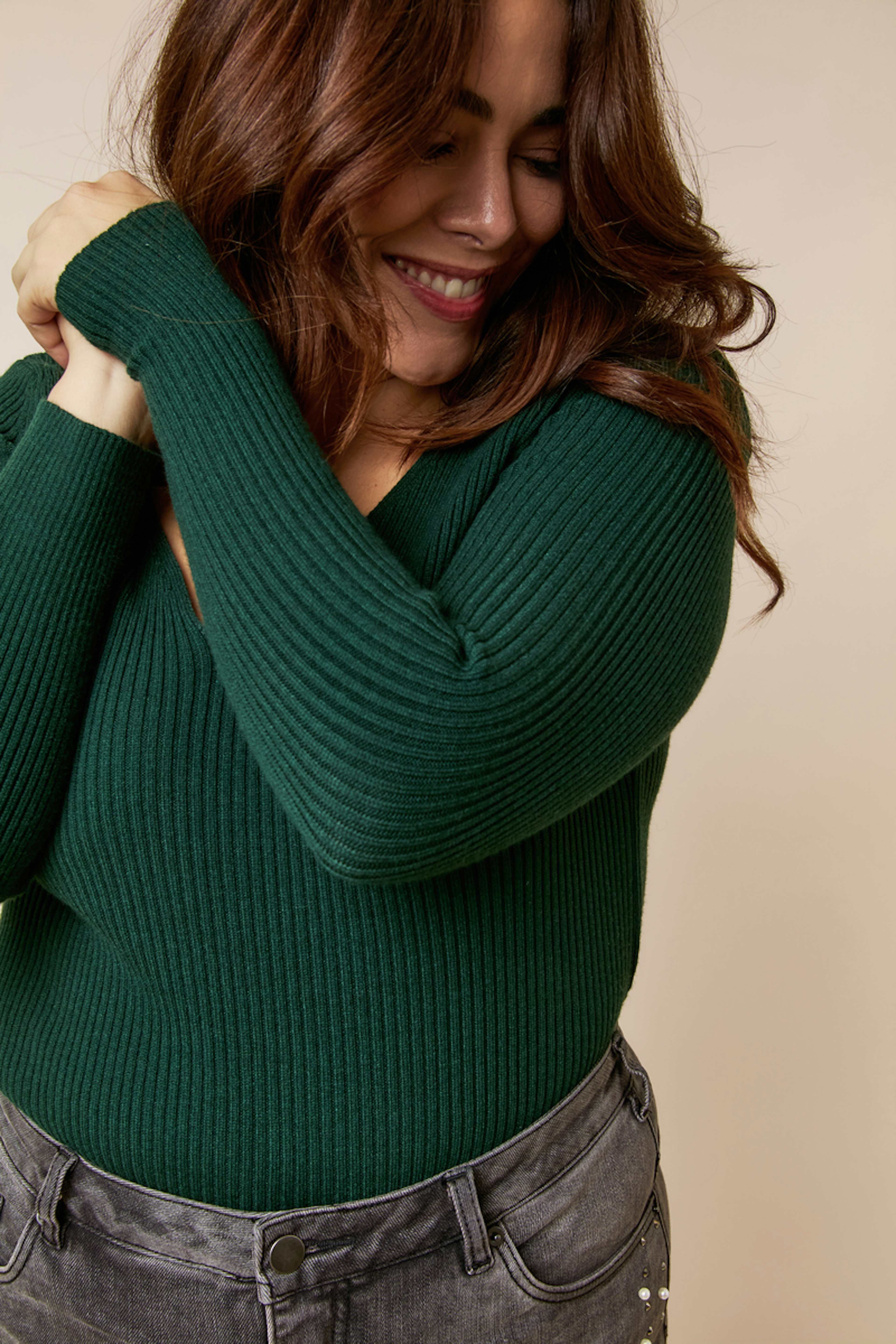 Pour un look cosy et chic, portez ce pull vert avec une jupe plissée argentée et des bottes en daim. Parfait pour les soirées fraîches d'hiver. • Pull en laine côtelée • Col en V flatteur • Manches longues • Coupe ajustée • Coloris vert profond
