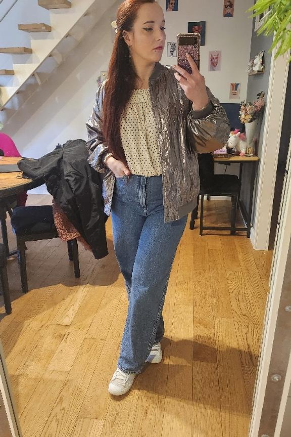 โข Veste bomber effet mรฉtallisรฉ โข Coupe oversize โข Manches longues bouffantes โข Fermeture par boutons pression โข Deux poches devant โข Bords cรดtes au col, aux poignets et sur le bas