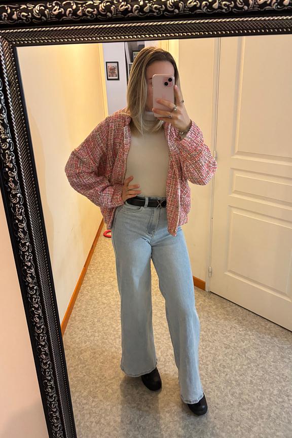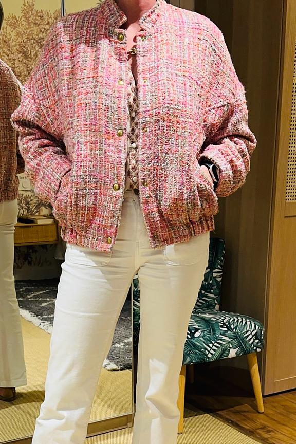 Ajoutez ce bomber ร votre collection pour une allure รฉlรฉgante et chaleureuse en toute circonstance! Parfait pour les journรฉes fraรฎches d'hiver, il ajoutera une touche de couleur ร votre garde-robe. โข Bomber rose avec lurex โข Bomber en tweed โข Coupe ample et confortable โข Manches longues et bouffantes โข Fermeture ร boutons-pression Ajoutez ce bomber ร votre collection pour une allure รฉlรฉgante et chaleureuse en toute circonstance!