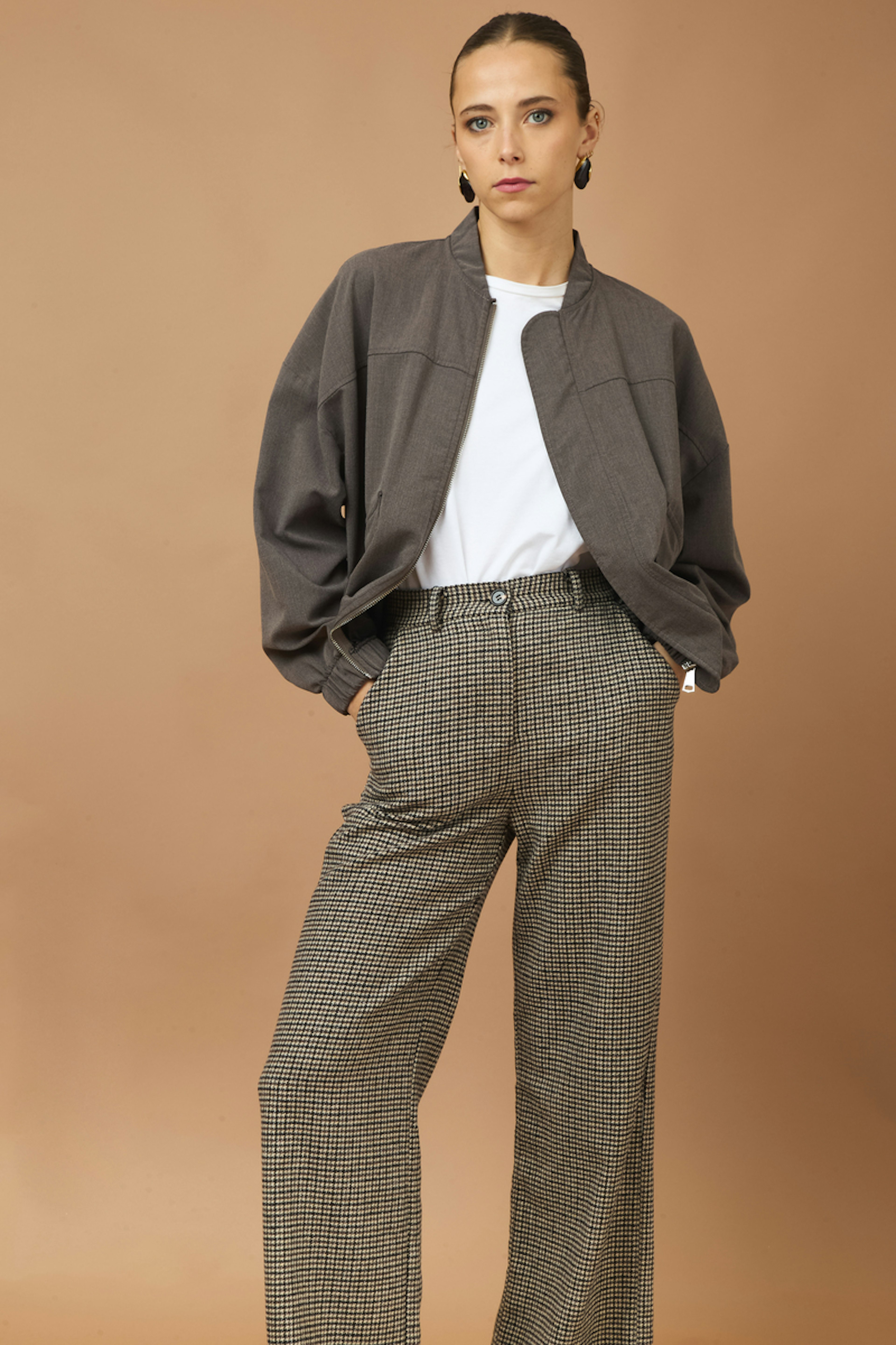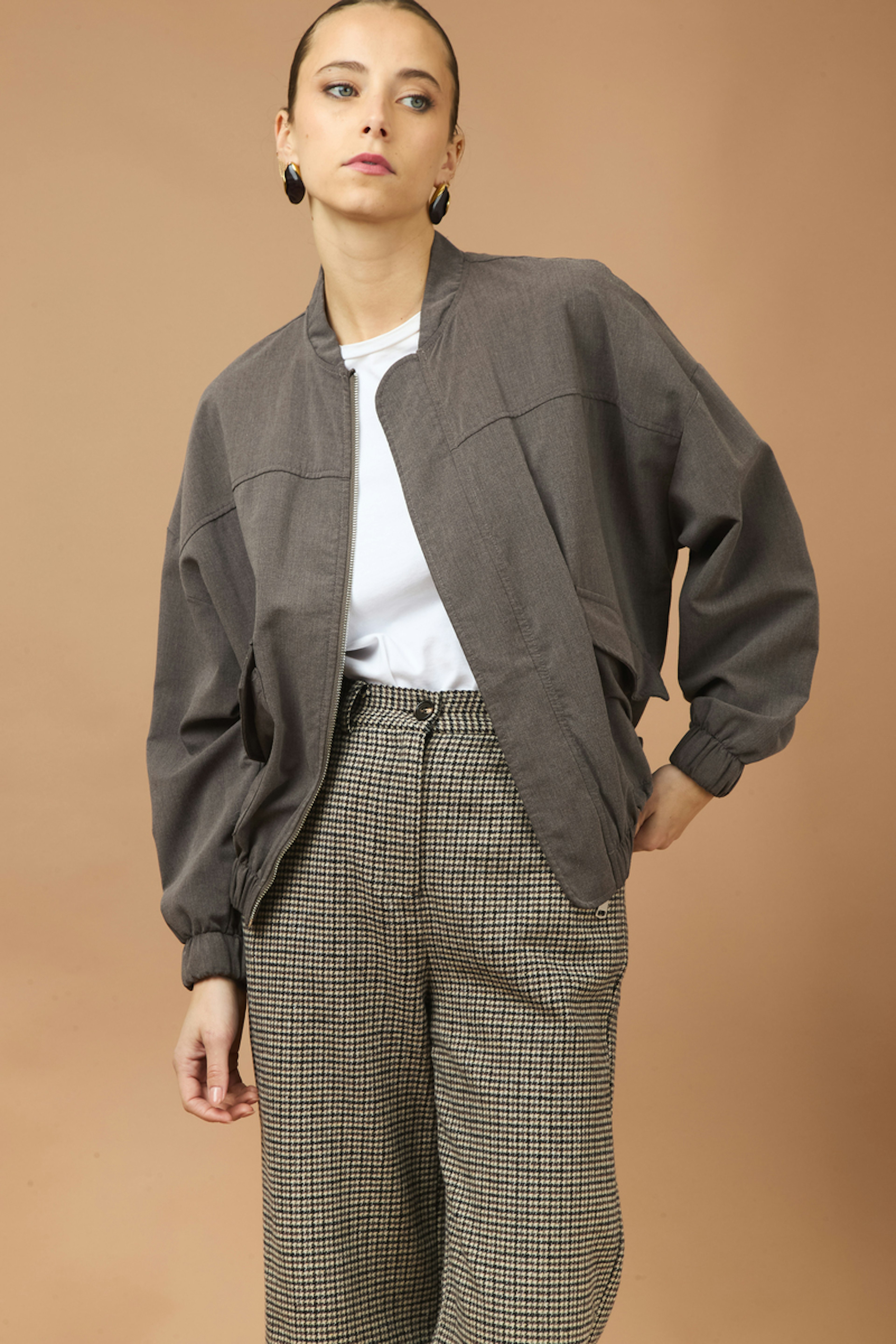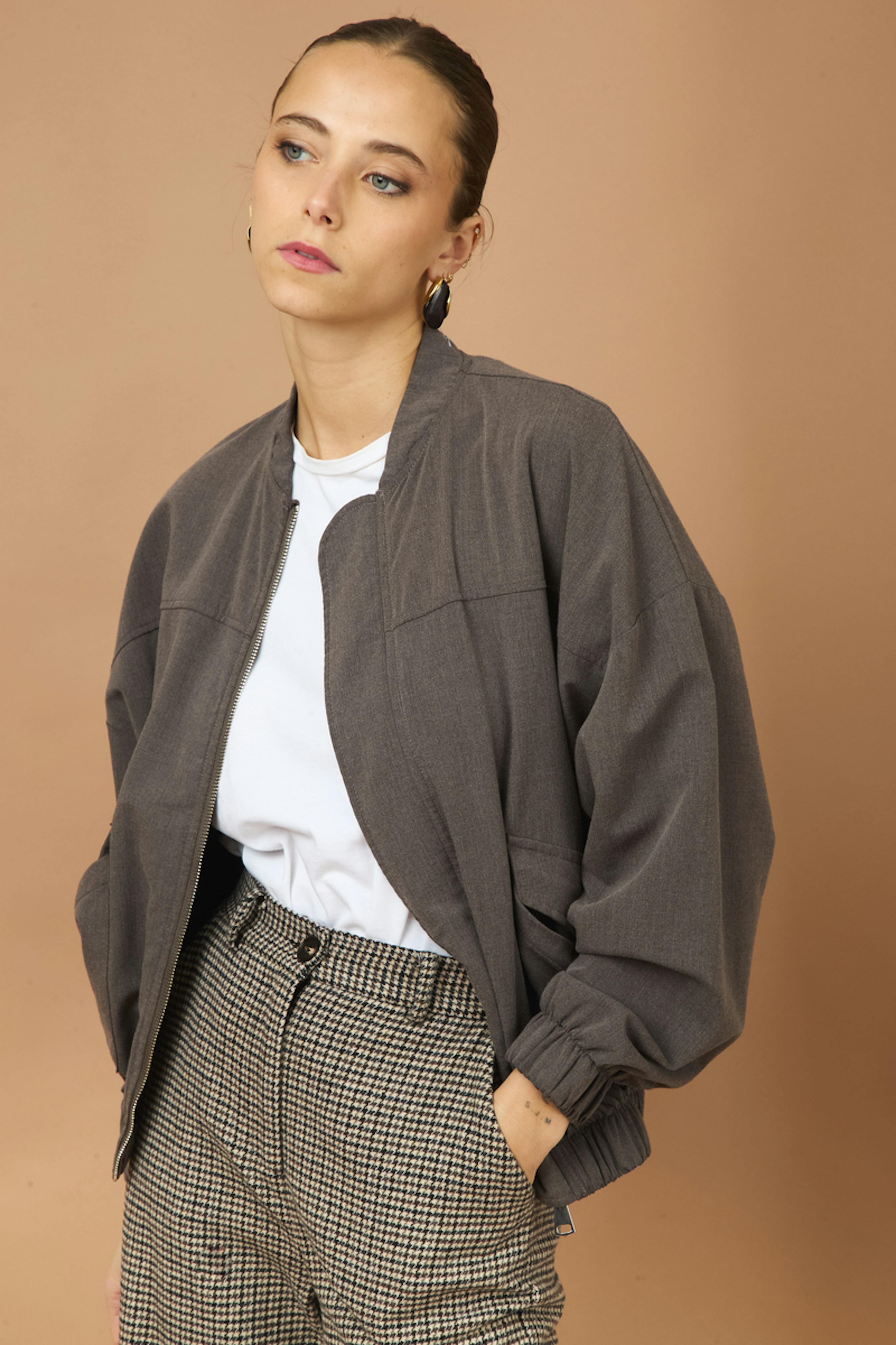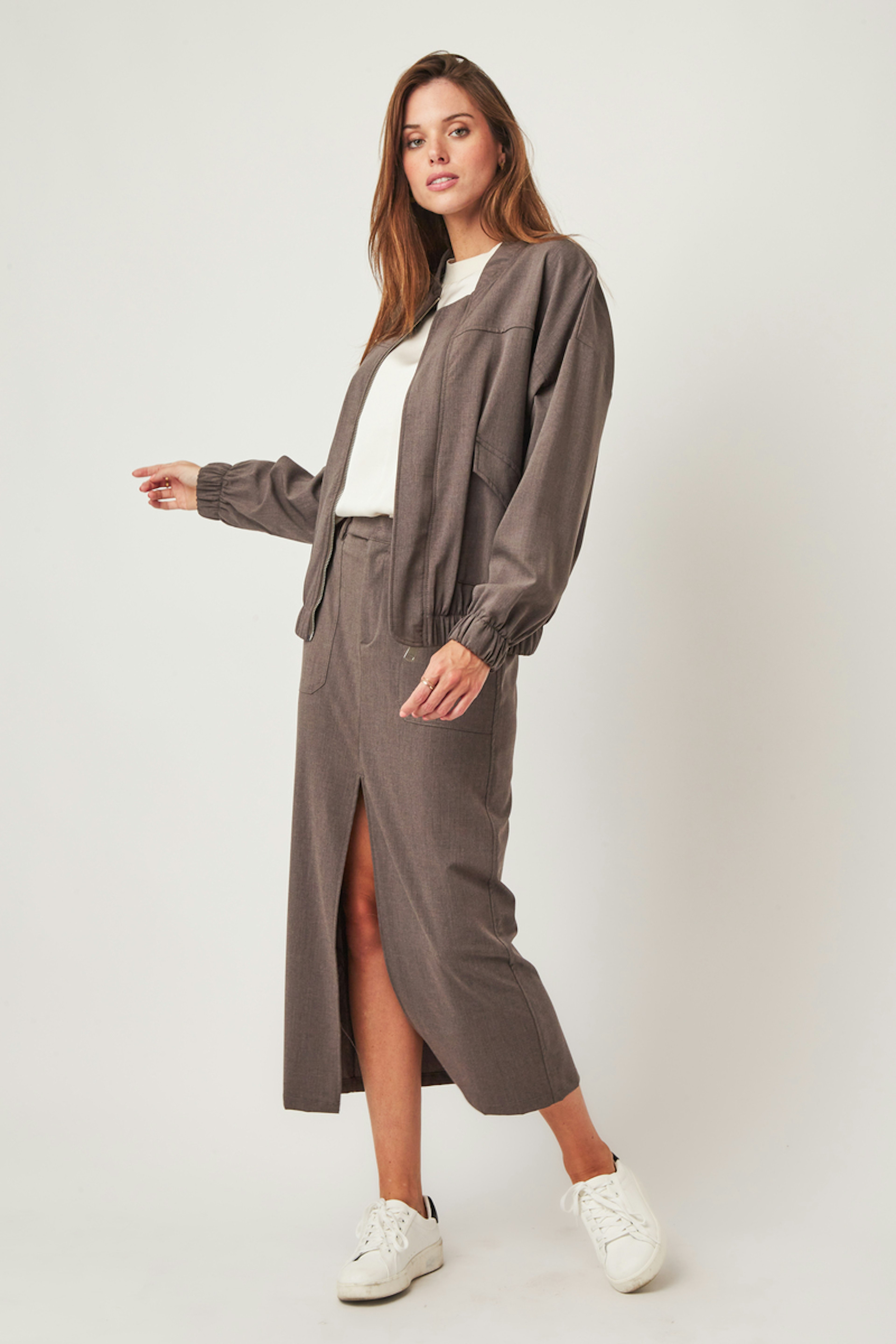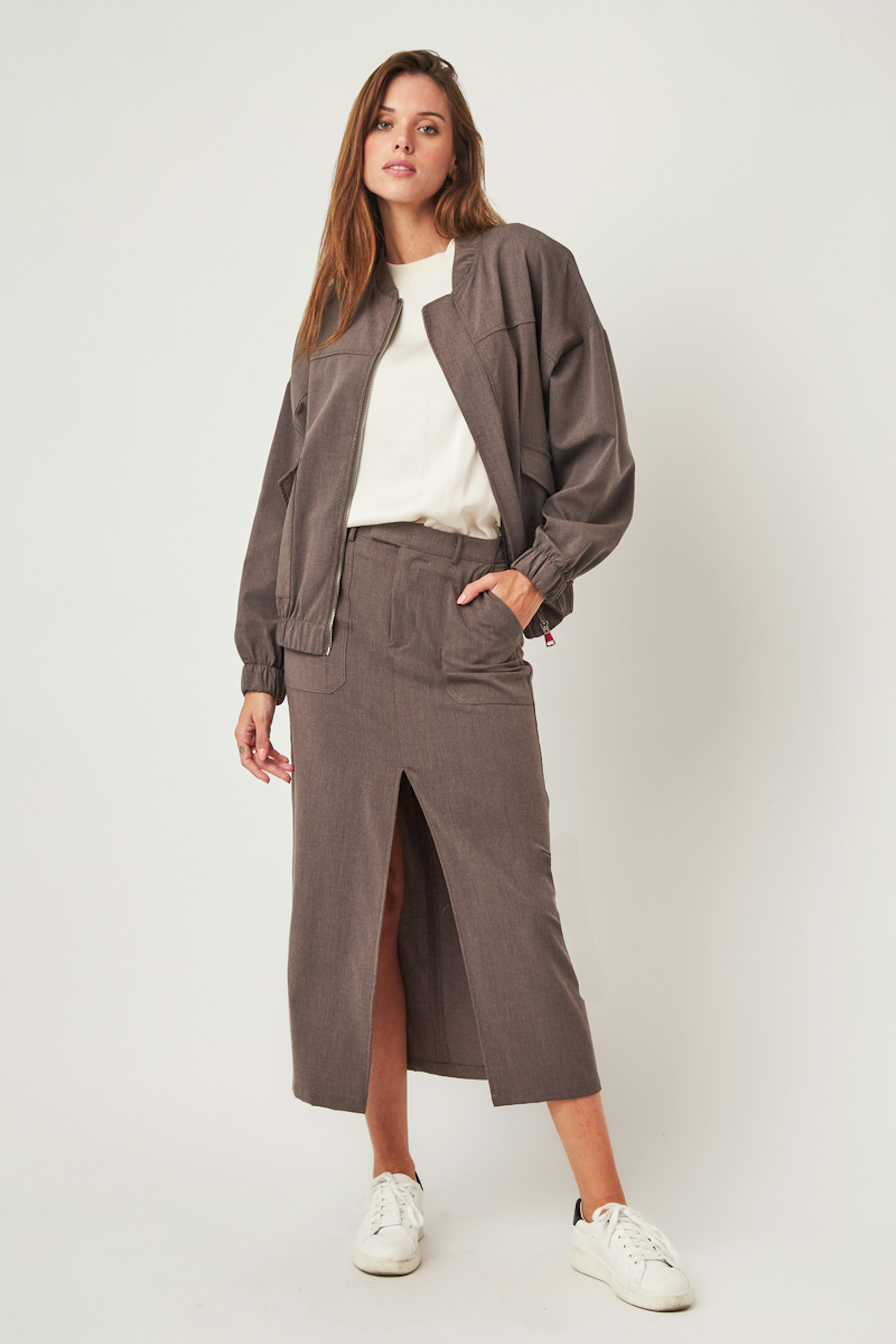 Adoptez un look moderne en associant ce bomber avec un pantalon slim noir et des baskets blanches. Idรฉal pour toutes les saisons. โข Bomber marron chinรฉ โข Coupe oversize โข Fermeture zippรฉe โข รlastique ร la taille et aux manches โข Poches latรฉrales pratiques โข Ensemble fluide avec jupe longue ร fente