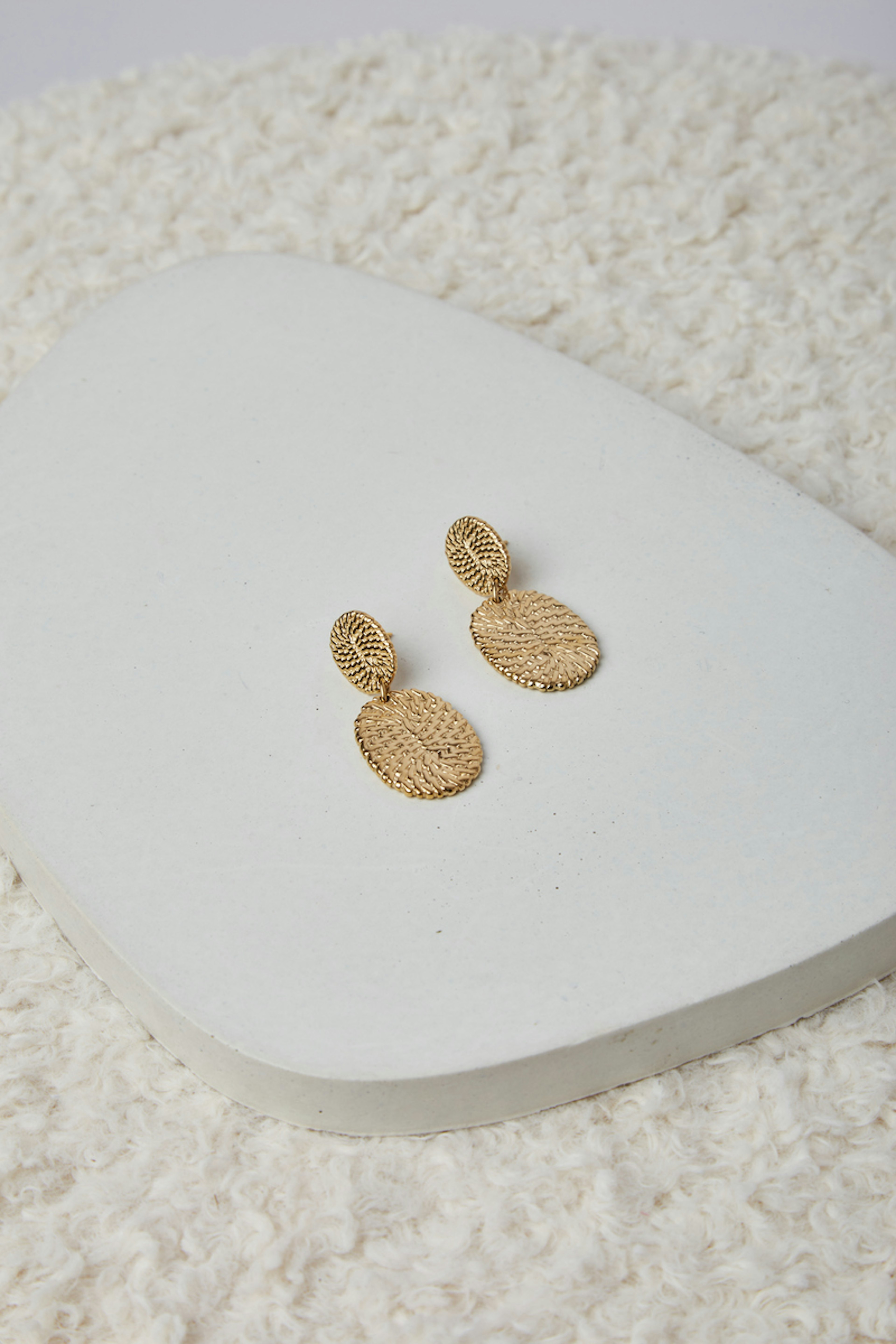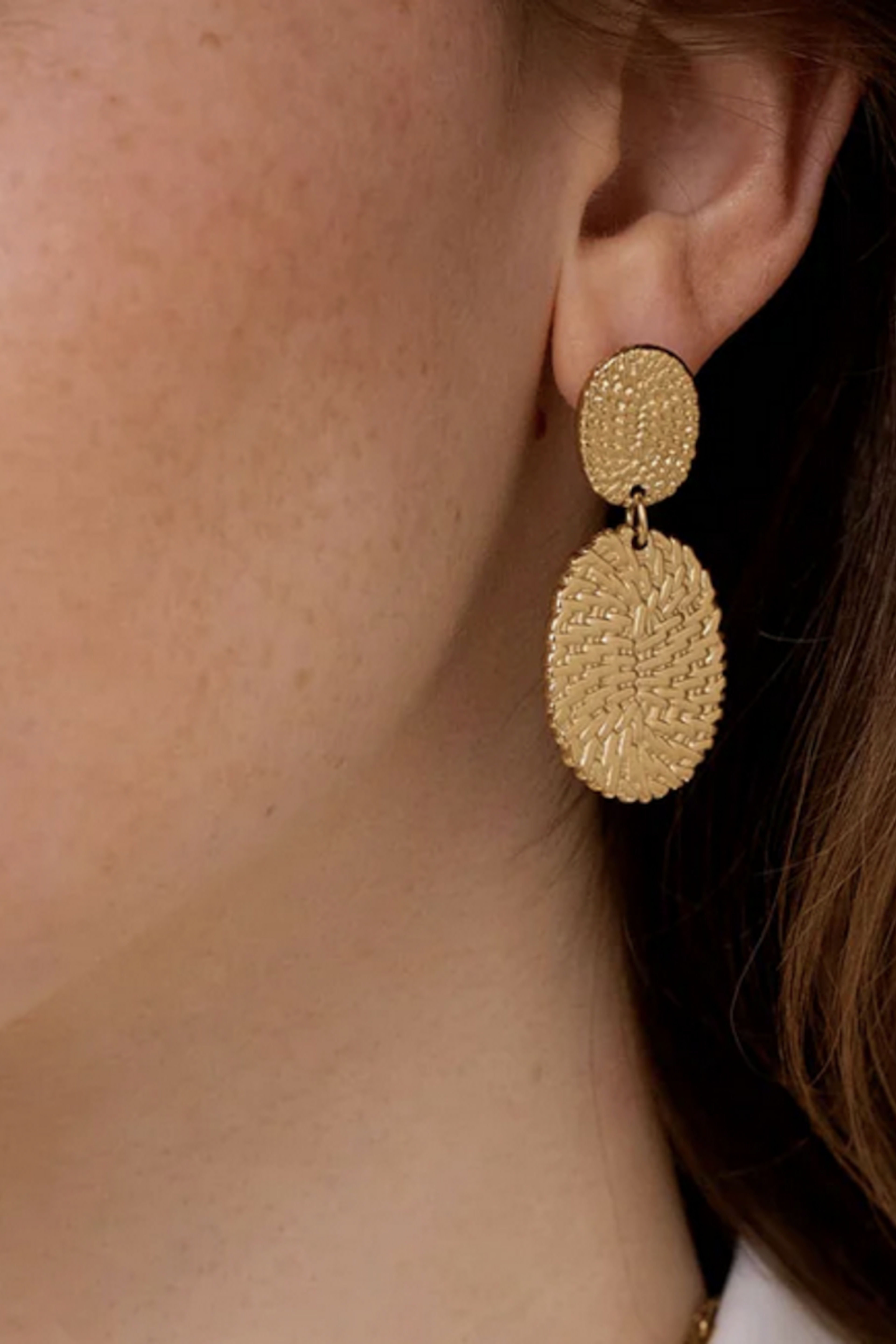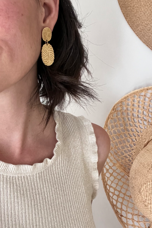 โข Boucles d'oreilles graphiques ร puce composรฉes de deux piรจces ovales texturรฉes โข Fermoir papillon โข Hypoallergรฉnique, ce bijou rรฉsiste ร l'eau et ne noircit pas.