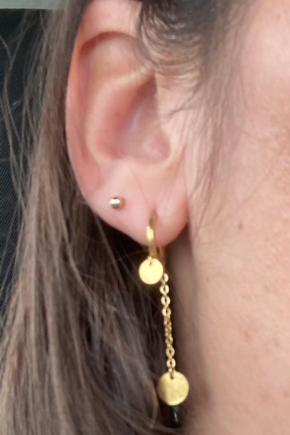 Boucles d'oreilles type crรฉoles composรฉes d'un jeu de pampilles rondes et une chaine pendante. โข Fermoir charniรจre โข Dimension: 0,7 x 4 cm (diamรจtre crรฉole: 1,20 cm) โข Matiรจre : Acier inoxydable โข Hypoallergรฉnique, ce bijou rรฉsiste ร l'eau et ne noircit pas