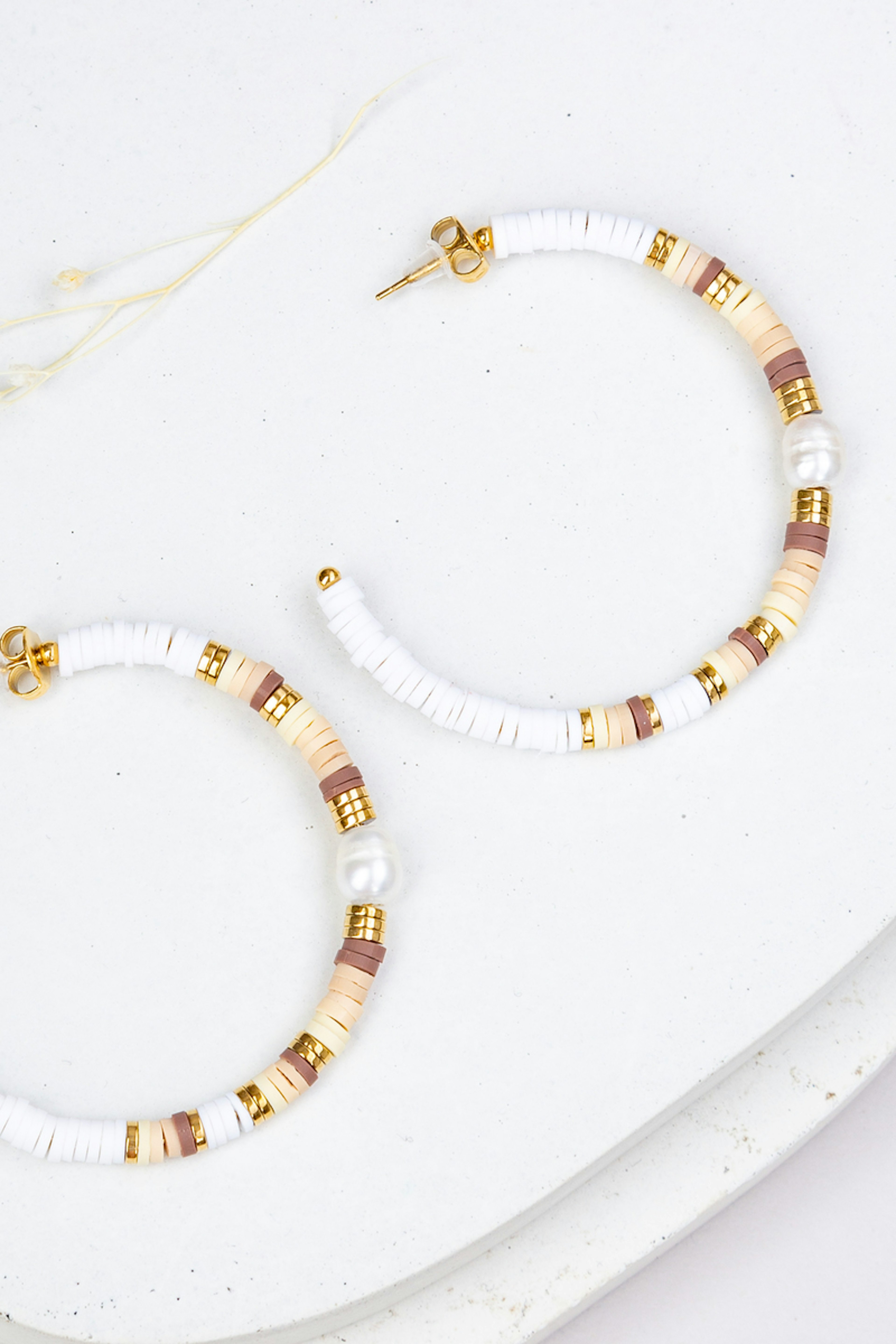 โข Boucles d'oreilles type crรฉoles ร puce ornรฉes de perles Heishi colorรฉes et d'une perle d'eau douce โข Fermoir papillon โข Matiรจre : Acier inoxydable โข Hypoallergรฉnique, ce bijou rรฉsiste ร l'eau et ne noircit pas โข Diamรจtre : 5 cm