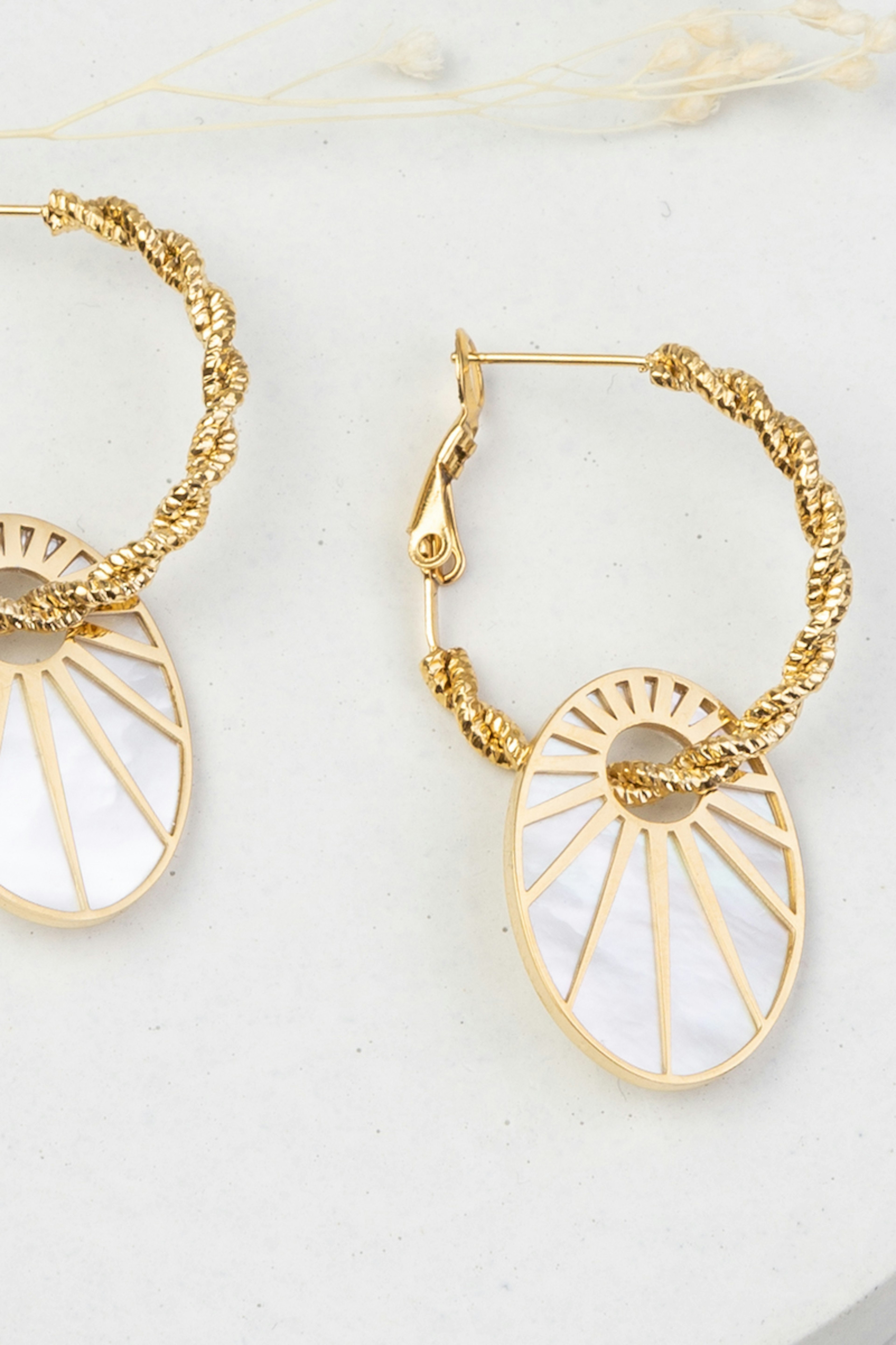 โข Boucles d'oreilles type crรฉoles torsadรฉes en acier inoxydable composรฉes d'un mรฉdaillon en acรฉtate teintรฉ ovale avec un รฉclat de lumiรจre ajourรฉ โข Dimensions de la crรฉole : 25 x 25 mm โข Dimensions du pendentif : 17 x 24 mm โข Rรฉsiste ร lโeau et ne noircit pas