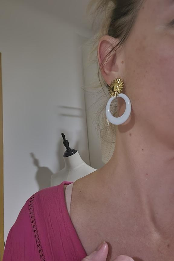Ajoutez une touche de fantaisie à votre tenue avec ces boucles d'oreilles dynamiques. Parfaites pour toutes les saisons, elles se marient à merveille avec une tenue décontractée ou élégante. • Boucles d'oreilles en acier • Design circulaire et original • Fermoir solide et sécurisé • Élément doré en forme de soleil • Détail bleu accrocheur