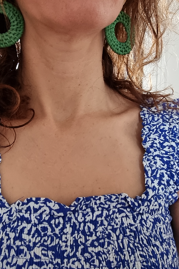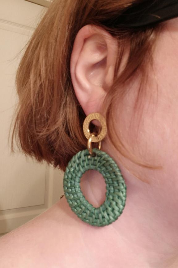 โข Boucles d'oreilles dorรฉes ร puces โข Double empiรจcement entrelacรฉ dorรฉ ร texture martelรฉe et empiรจcement tressรฉ vert