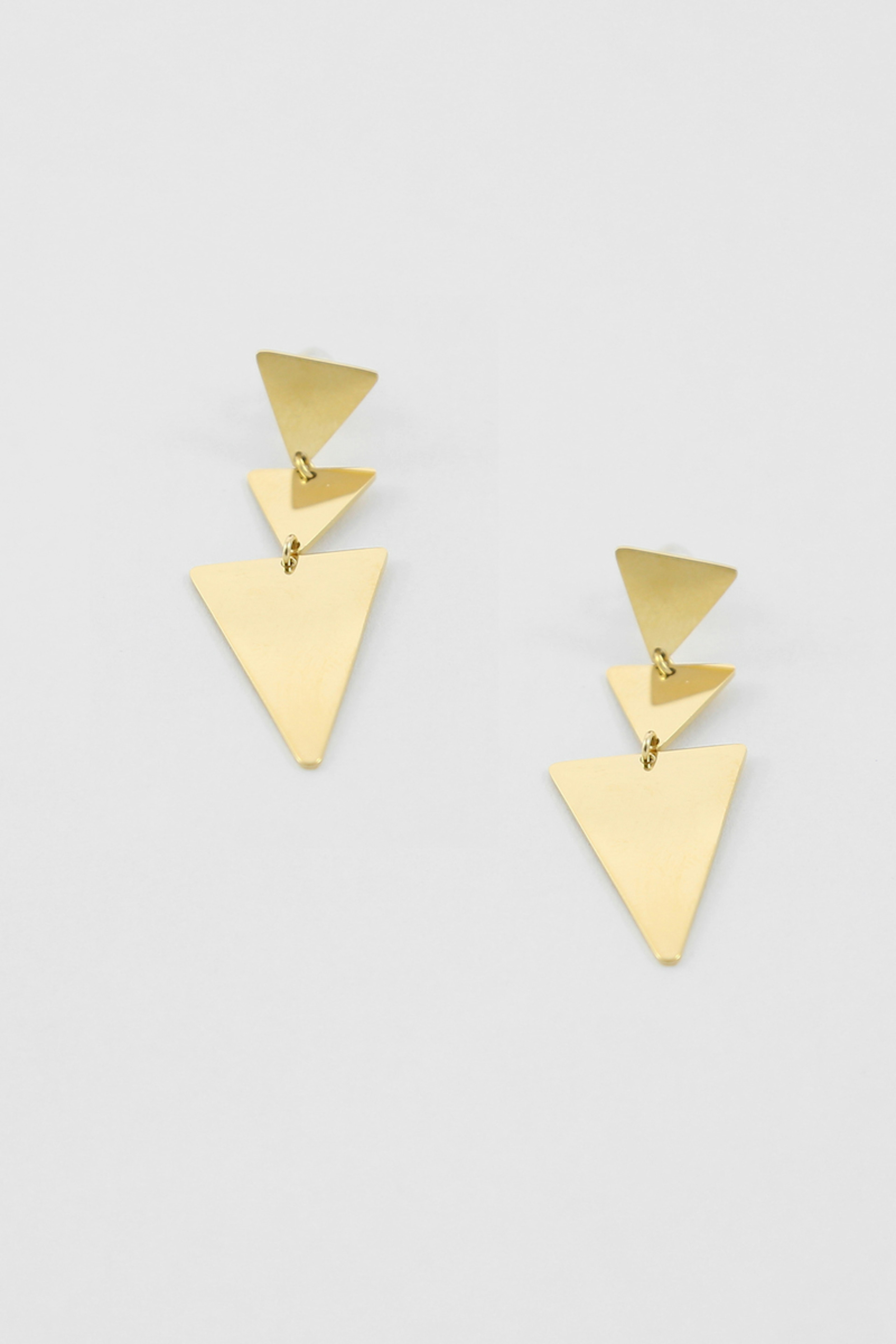 Boucles d'oreilles pendantes or avec triangles de diffรฉrentes tailles.