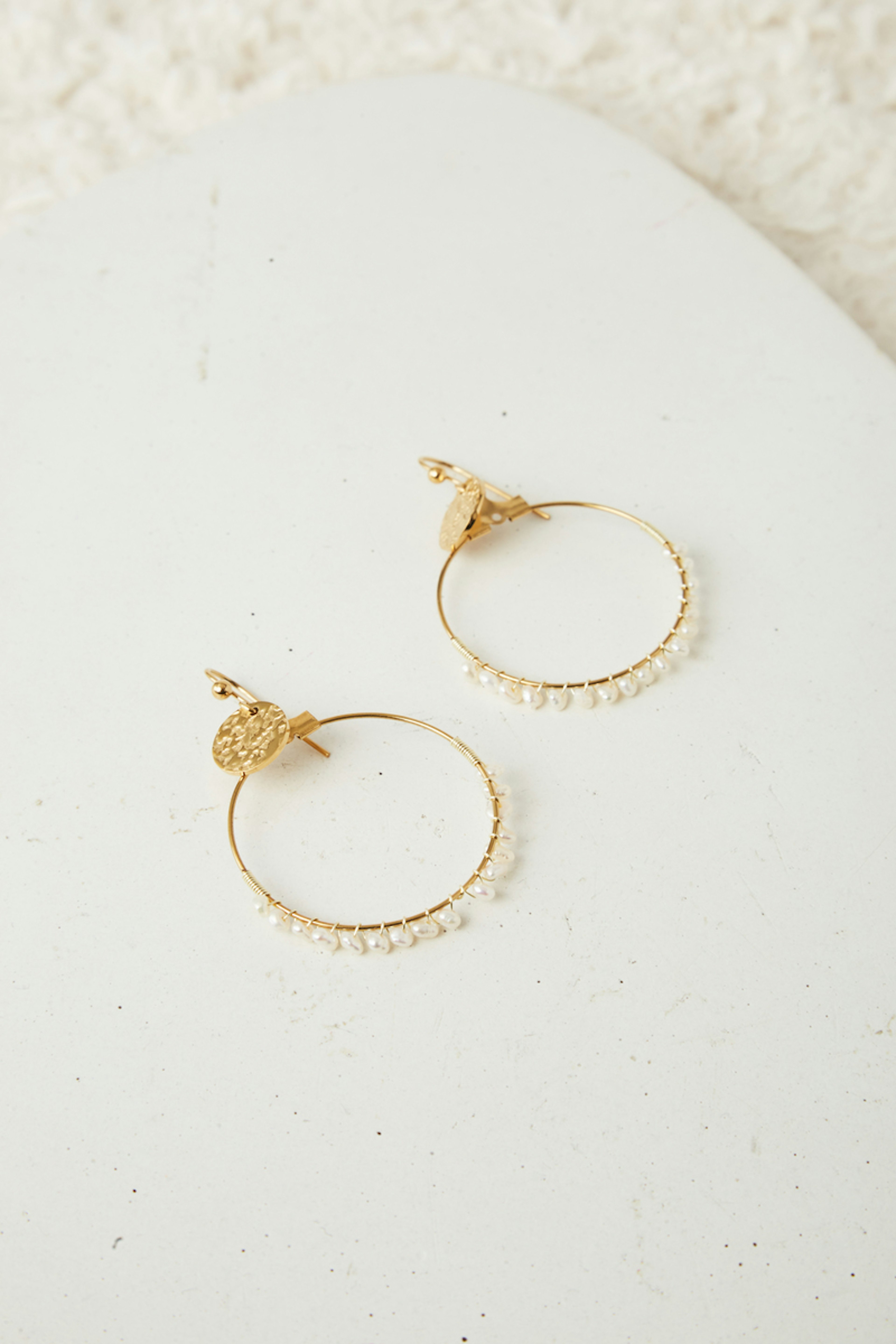 โข Boucles d'oreilles avec un cercle dorรฉ serti de perles โข Pendentif dorรฉ martelรฉ โข Fermoir crochet