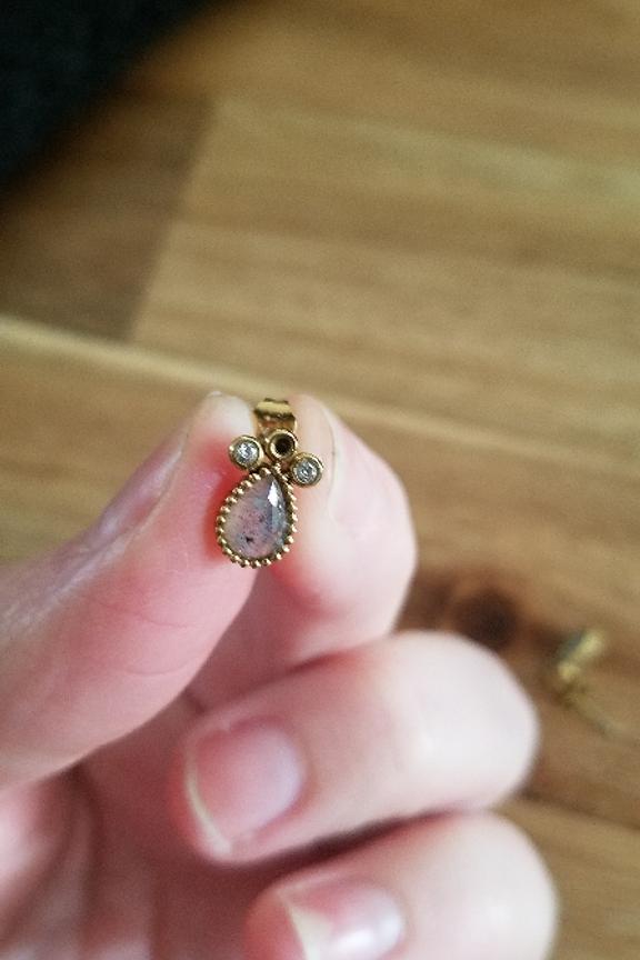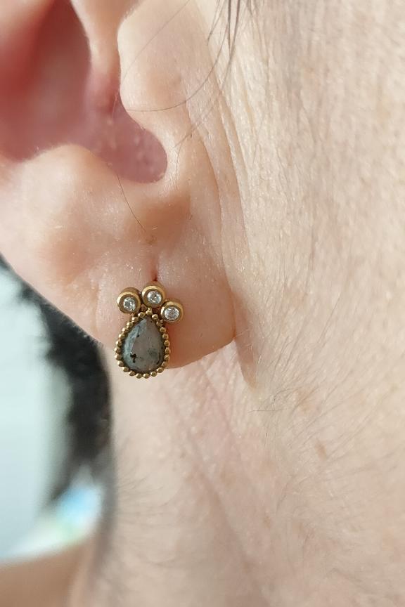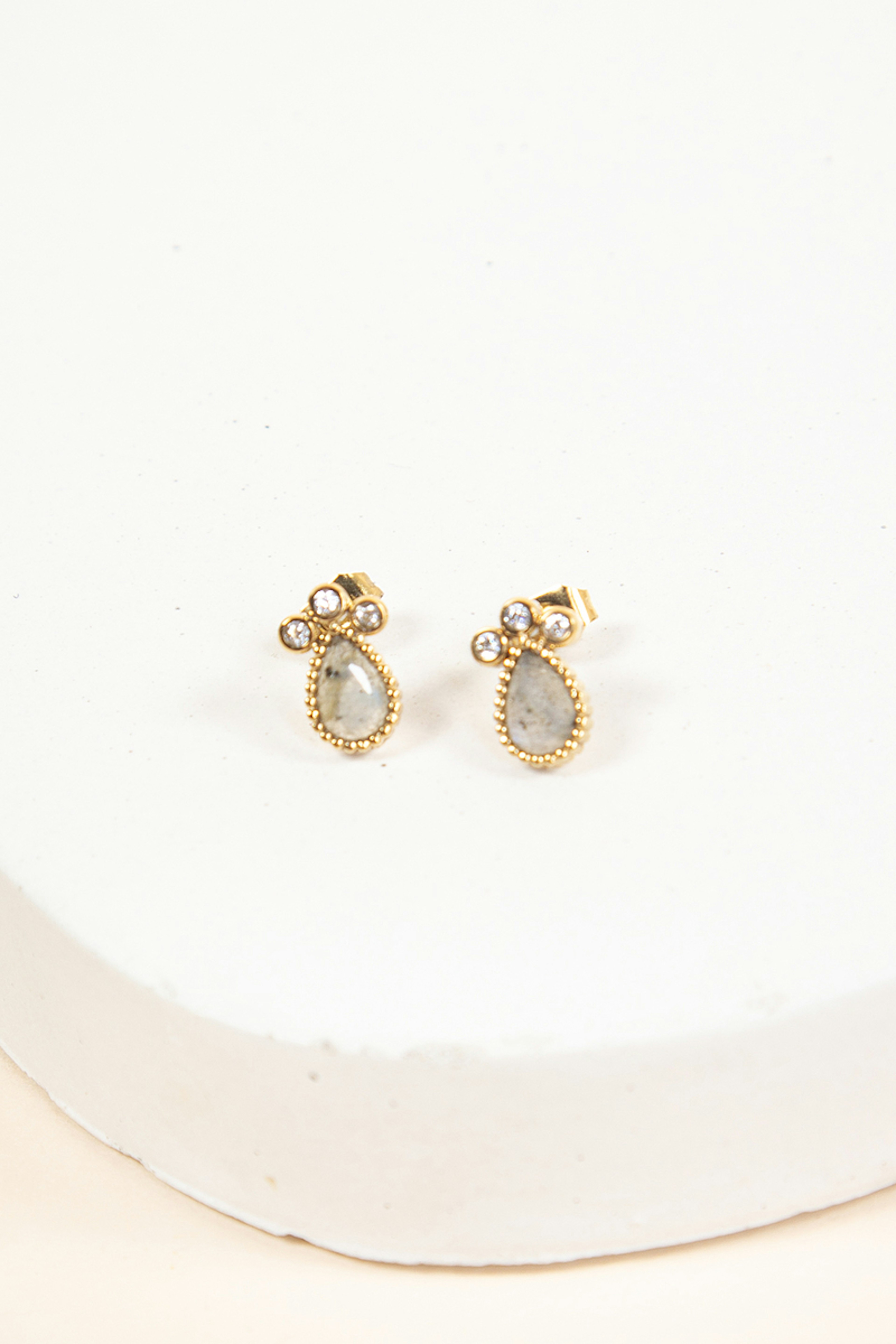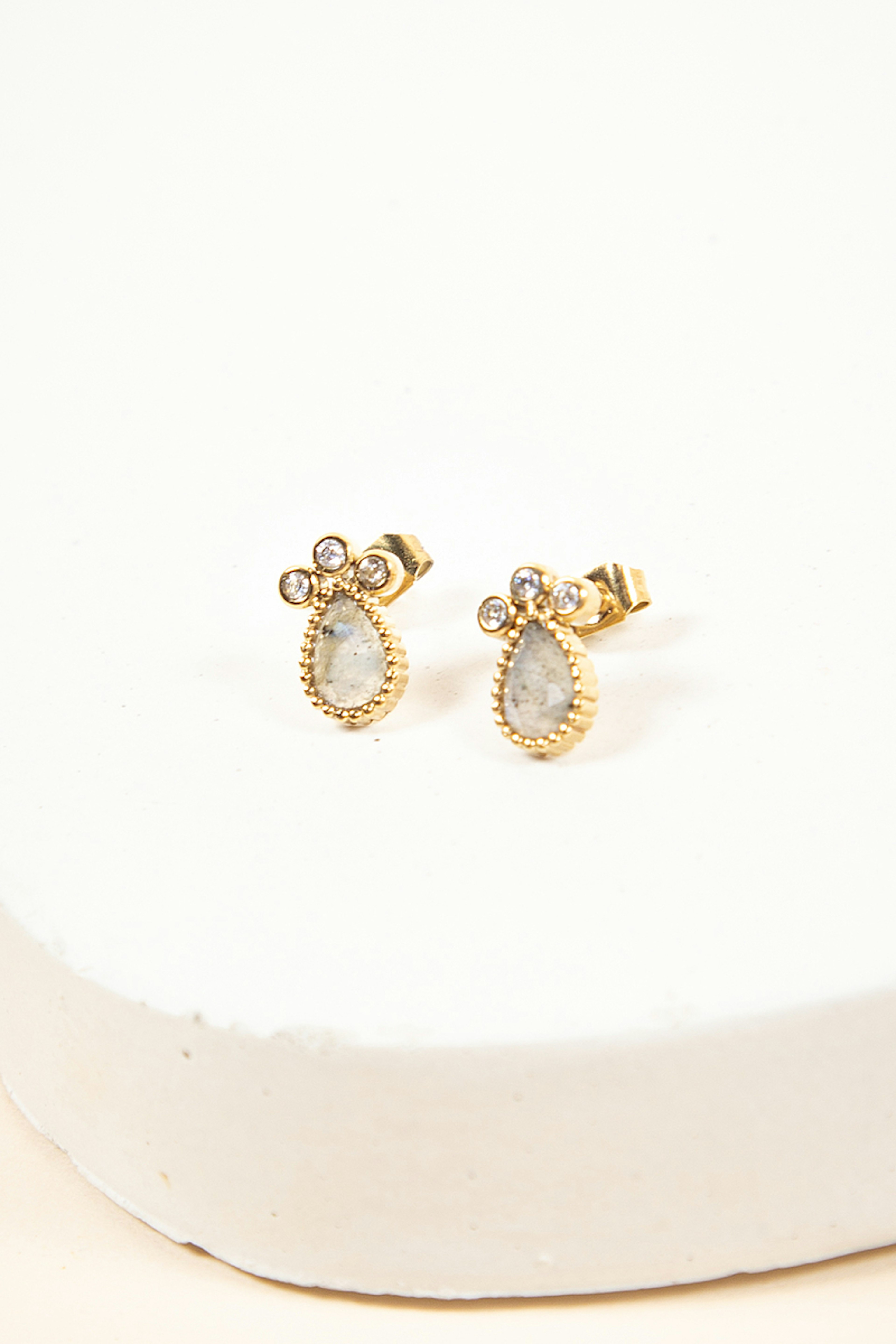 Les boucles d'oreilles Venus en forme de goutte sont serties d'une pierre naturelle labradorite et de trois oxydes de zirconium. Elles sont en acier inoxydable.