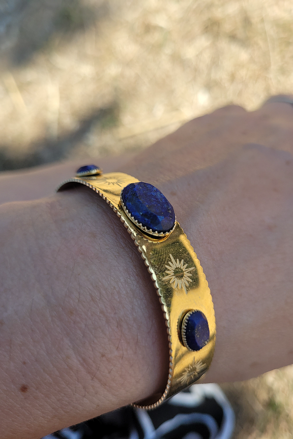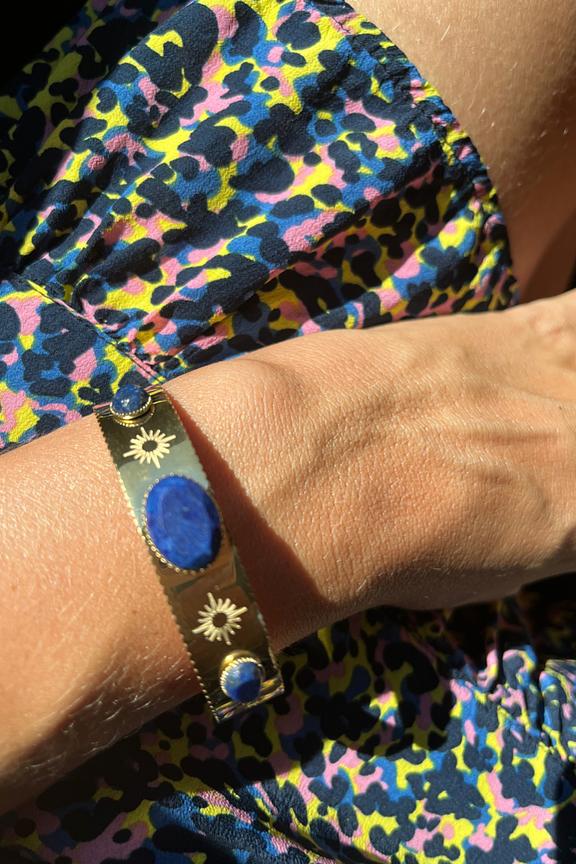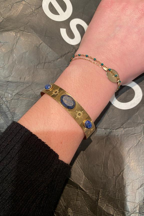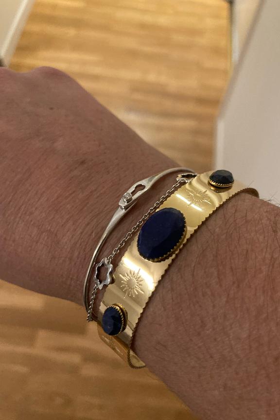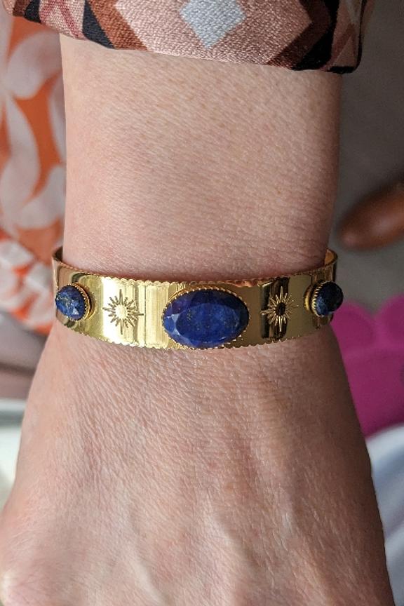 โข Jonc mallรฉable composรฉ de pierres naturelles โข Pierre naturelle : Lapis Lazuli โข Acier inoxydable โข Hypoallergรฉnique, ce bijou rรฉsiste ร l'eau et ne noircit pas