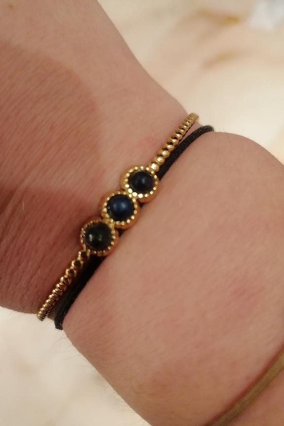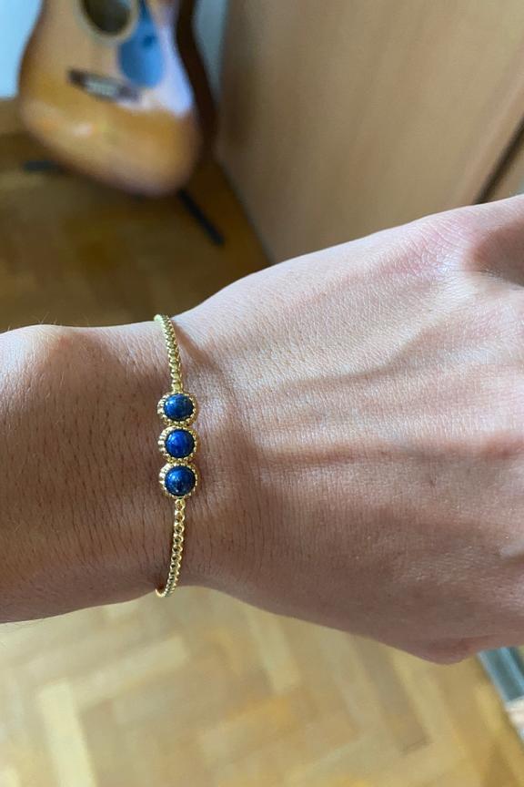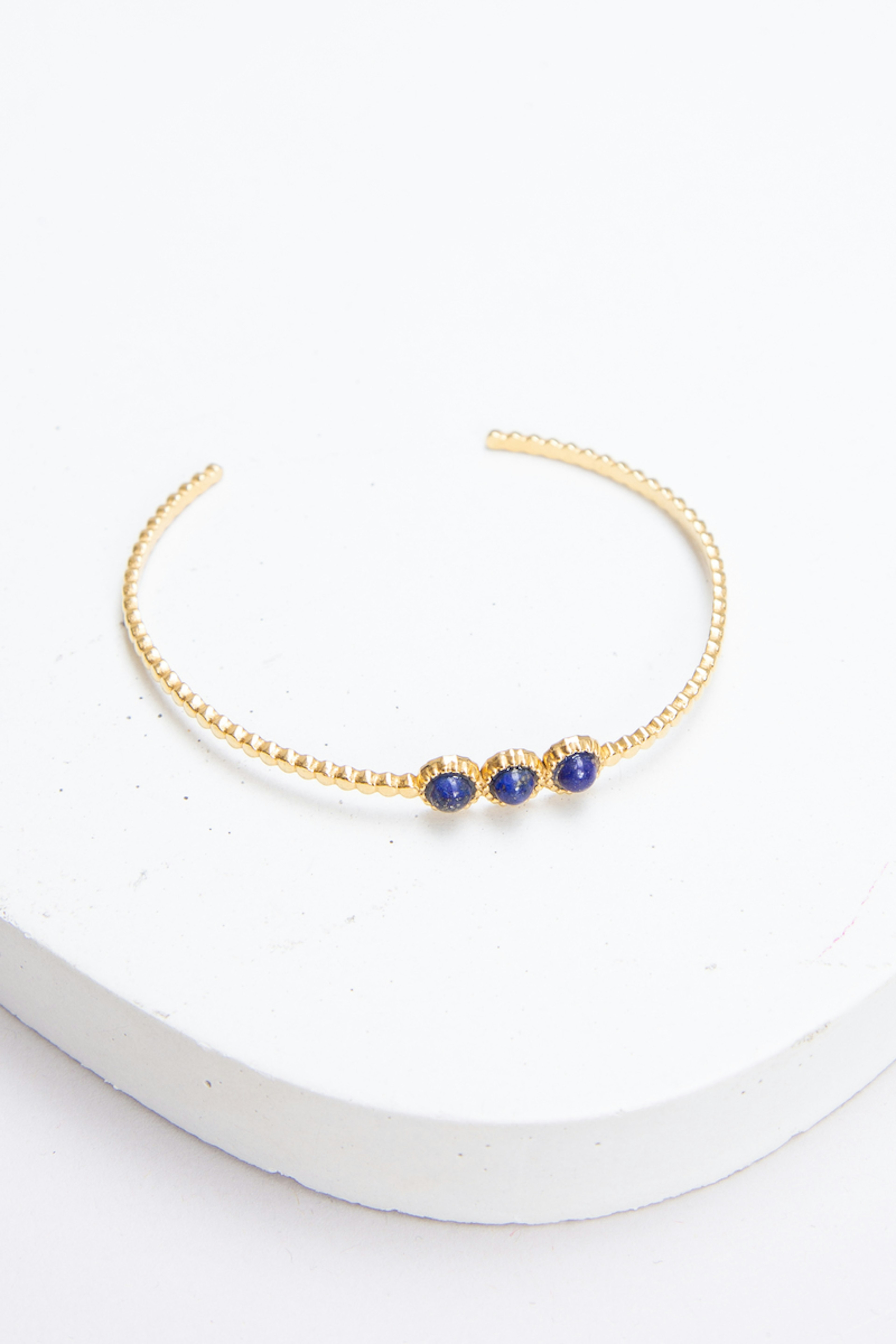 Bracelet de type jonc ajustable avec 3 petites pierres naturelles. โข Pierre naturelle : lapis lazuli โข Acier inoxydable โข Hypoallergรฉnique, ce bijou rรฉsiste ร l'eau et ne noircit pas โข รtant des pierres naturelles, leurs couleurs peuvent varier dโune pierre ร lโautre