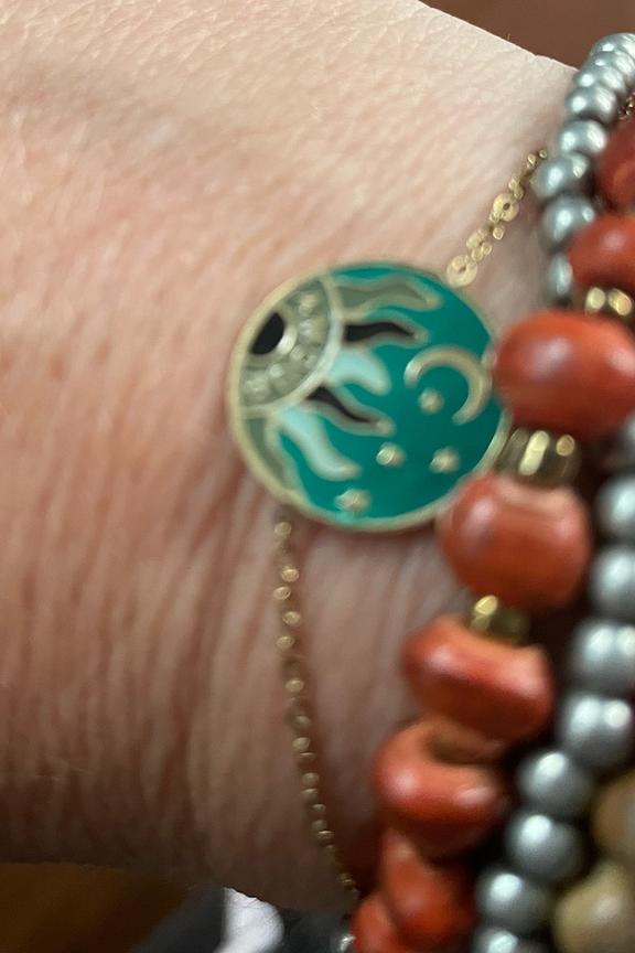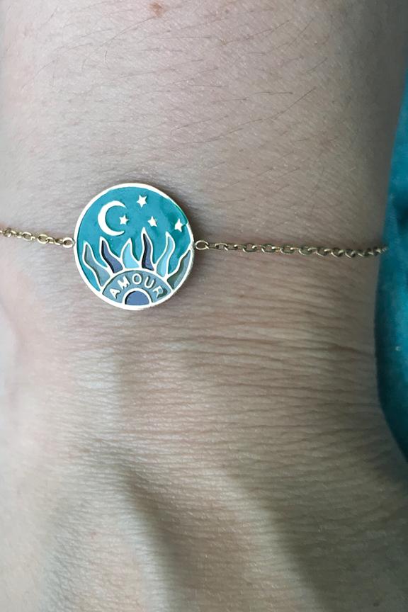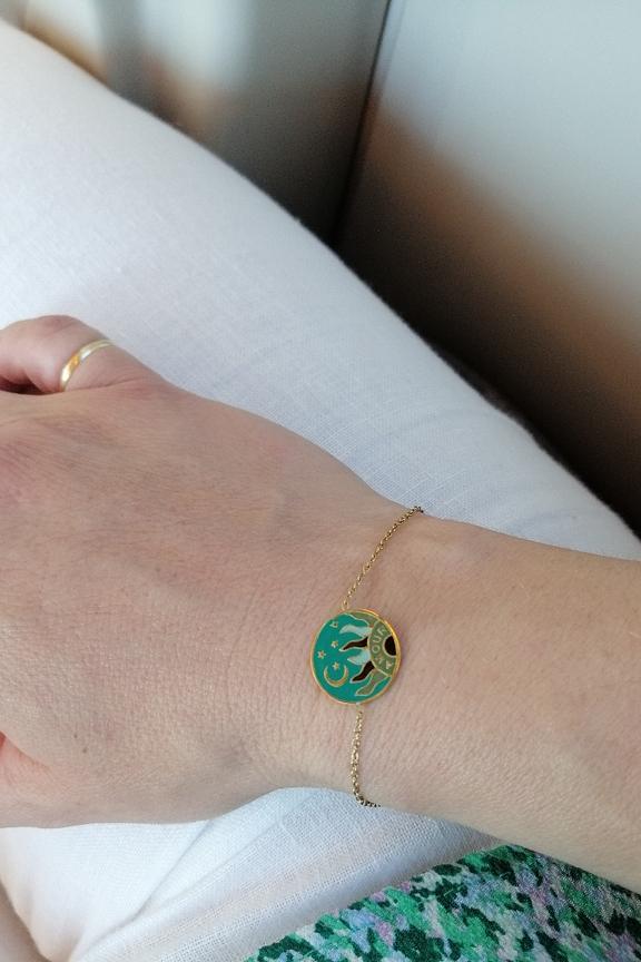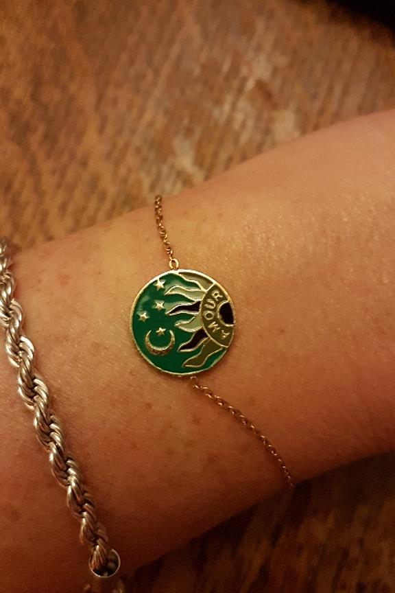 โข Bracelet fin en acier inoxydable dorรฉ โข Mรฉdaillon rond vert โข AMOUR gravรฉ dessus