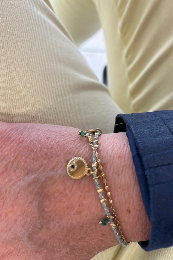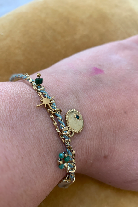 Bracelet 2 rangs, l'un en cordon et l'autre en acier inoxydable, composรฉ de pampilles rondes et de breloques en pierre naturelle. โข Longueur de la chaรฎne: 16cm Longueur de la chaรฎne de rรฉglette: 3cm โข Longueur totale du bracelet : 19cm โข Garantie sans nickel, sans cadmium, sans sel de plomb. โข Rรฉsiste ร lโeau et ne noircit pas. โข รtant des pierres naturelles, leurs couleurs et leur taille peuvent varier dโune pierre ร lโautre.