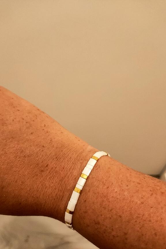 โข Bracelet รฉlastique composรฉ de perles japonaises โข Matiรจre : Acier inoxydable โข Hypoallergรฉnique, ce bijou rรฉsiste ร l'eau et ne noircit pas. โข รlastique : 16 cm