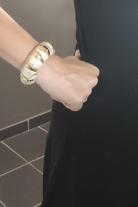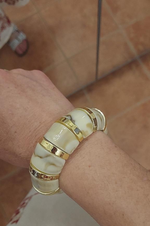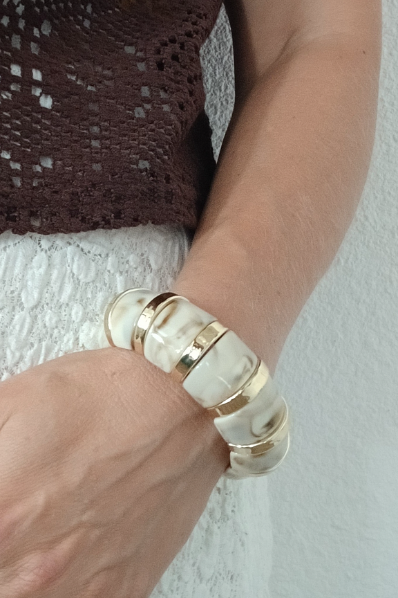 Ajoutez une touche d'élégance à votre tenue avec ce bracelet. Associez-le à une robe simple pour un look chic et intemporel, parfait pour toutes les saisons. • Bracelet en acier inoxydable • Design intemporel et élégant • Alliage de tons dorés et marbrés • Fermeture facile à clipser • Largeur confortable pour le poignet