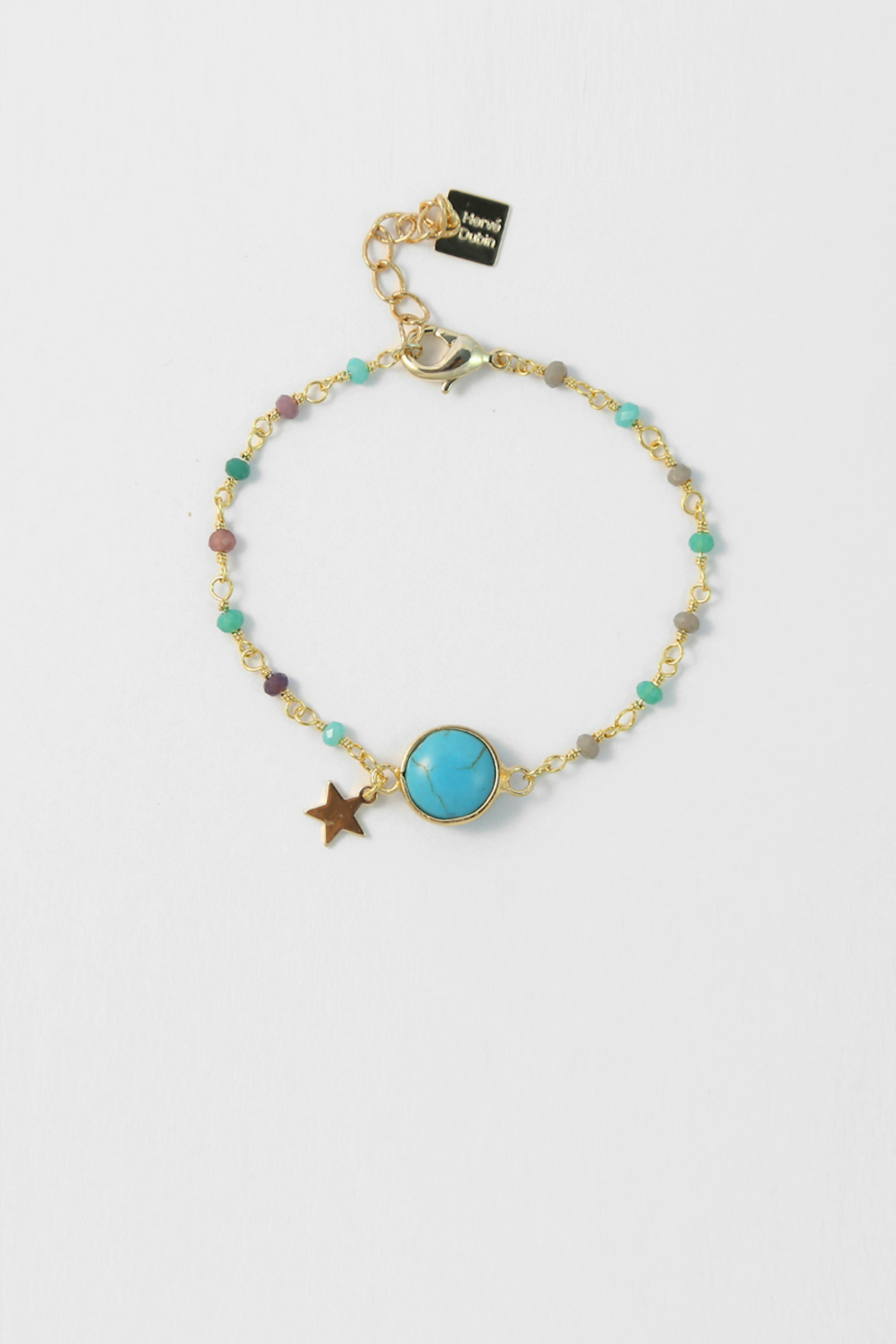 Bracelet chaรฎne or avec perles bleues et violettes et pendentif effet marbre bleu avec petite รฉtoile.