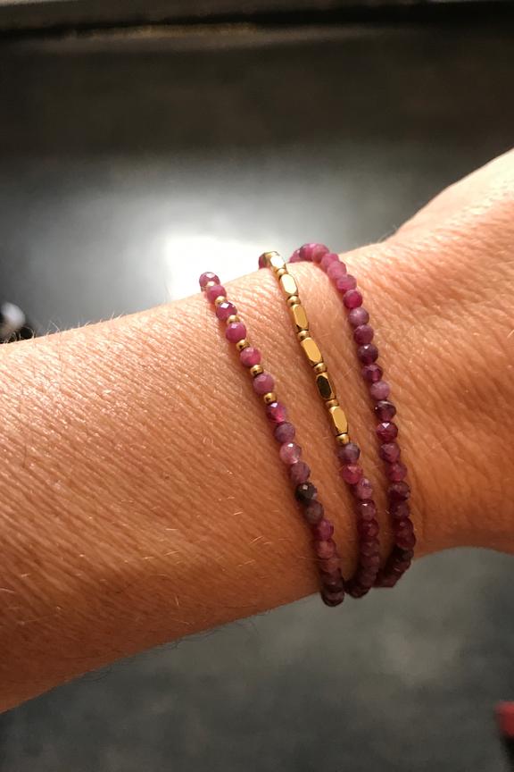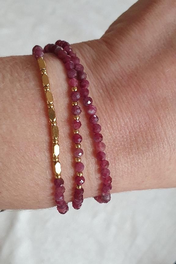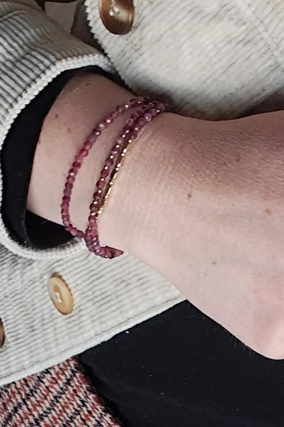 โข Bracelet ร triples chaรฎnes โข Chaรฎnes perlรฉes avec des pierres violettes โข Ajustable โข Conรงu en acier inoxydable