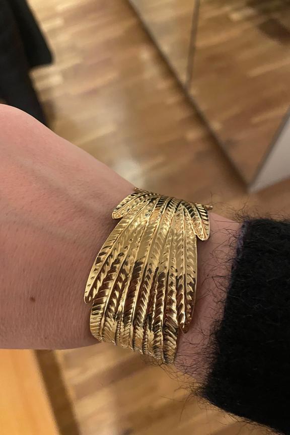 Ajoutez une touche d'élégance à votre tenue avec ce bracelet doré, parfait pour sublimer un look chic ou décontracté. Idéal en toute saison! • Bracelet en acier inoxydable • Forme ajustable • Design en feuille • Finition dorée • Texture détaillée