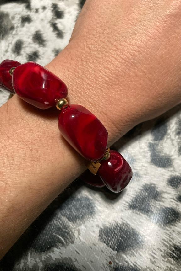 Portez ce bracelet rouge éclatant avec une blouse blanche vaporeuse et un jean taille haute pour un look chic et audacieux. • Bracelet moderne • Perles rouge vif • Éléments dorés brillants • Conception ajustable • Idéal en toute saison